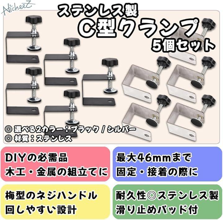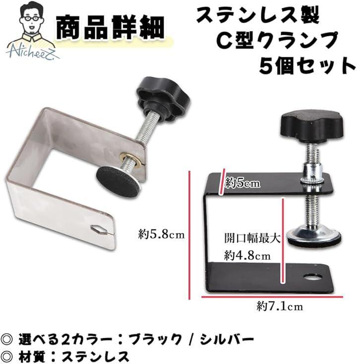 「商品内容」 ステンレス製C型クランプ5個セット 材質:ステンレス カラー:ブラック/シルバー サイズ:横/約71mm 縦/50mm 高さ/約58mm 開口幅/最大46mm