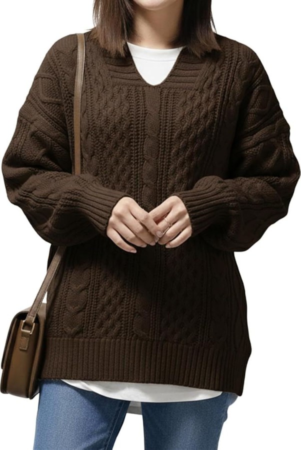 Cable knit V-neck skipper knit pullover sweater with keyhole neck and loose sleeves for women, perfect for autumn and winter