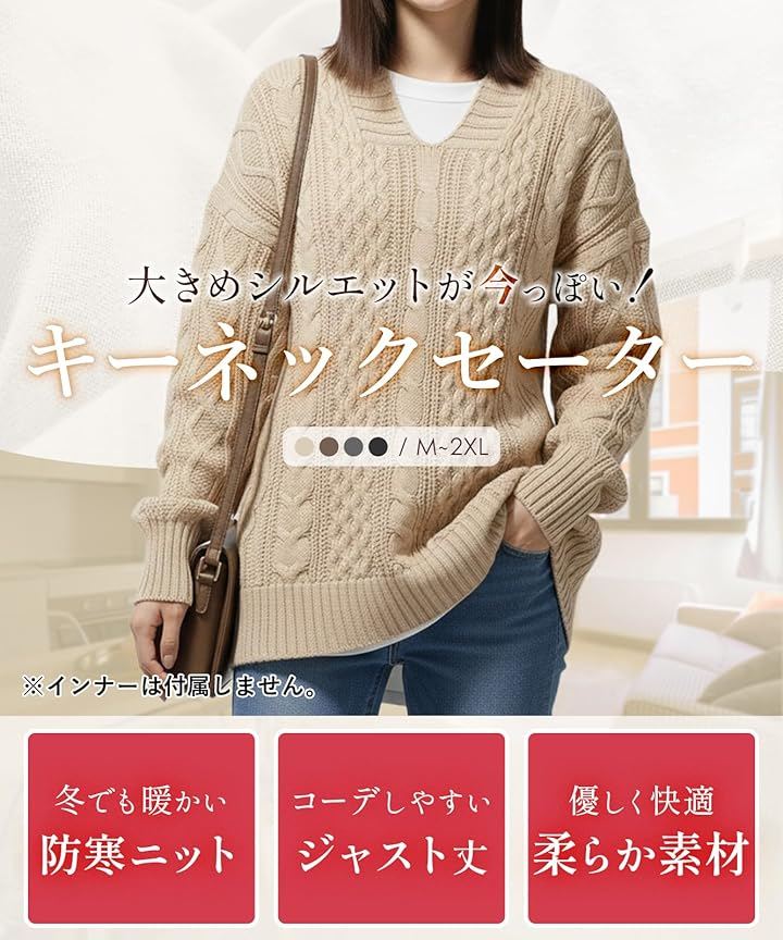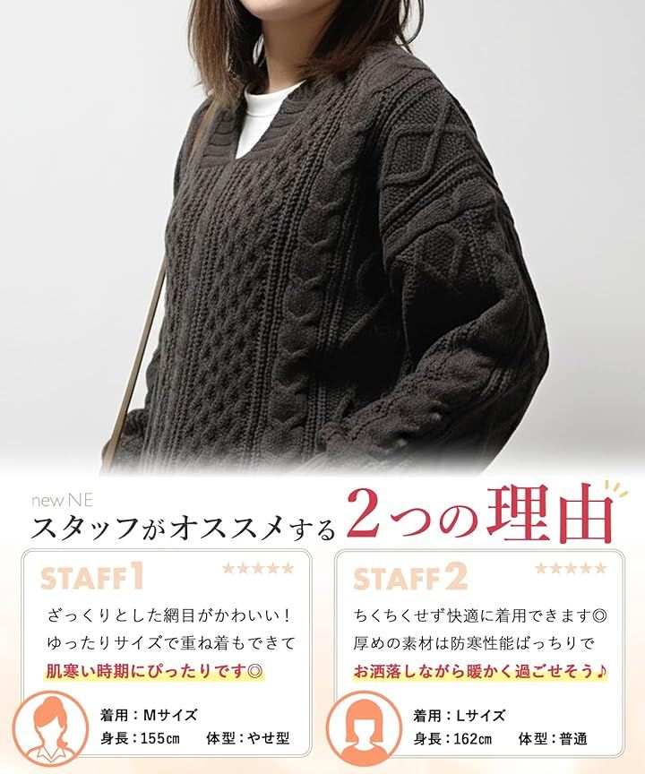 「今っぽシルエットで主役級のニットソー」大きめシルエットがトレンド感たっぷりのケーブル編みVネックニット。立体的な編み模様が存在感を放ち、シンプルなボトムに合わせるだけで一気におしゃれ上級者に。