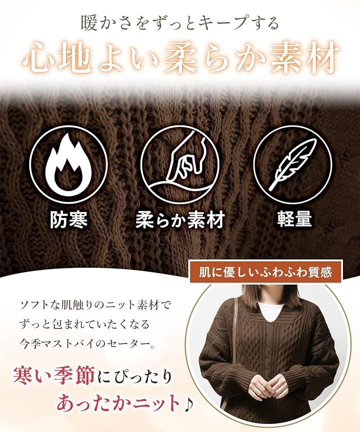 「今っぽシルエットで主役級のニットソー」大きめシルエットがトレンド感たっぷりのケーブル編みVネックニット。立体的な編み模様が存在感を放ち、シンプルなボトムに合わせるだけで一気におしゃれ上級者に。
