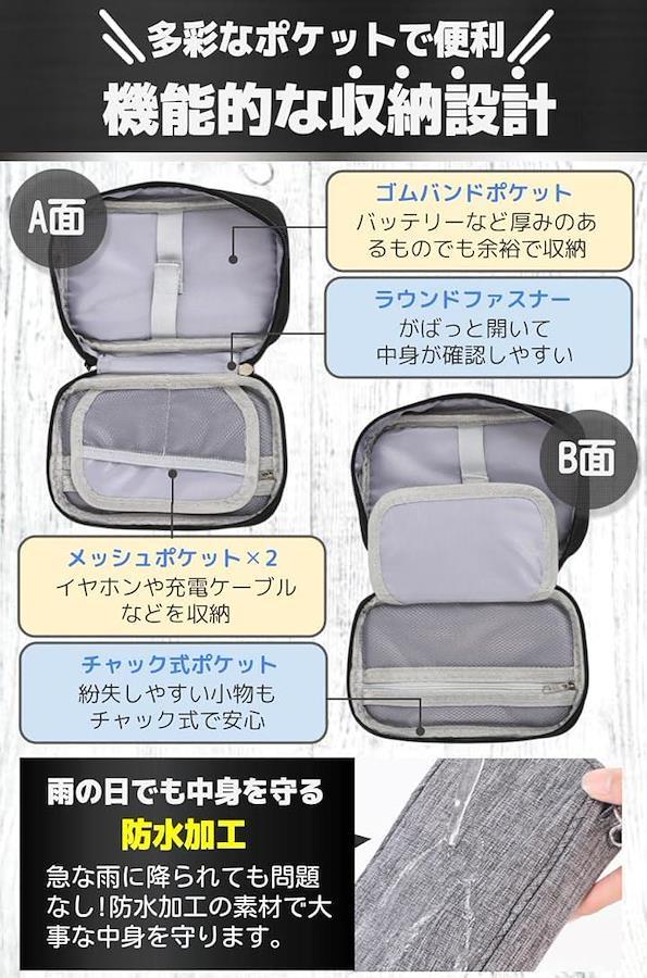 「機能的な収納設計」多彩なポケットで便利 ゴムバンドポケット:バッテリーなど厚みのあるものでも余裕で収納 ラウンドファスナー:がばっと開いて中身が確認しやすい メッシュポケットx2:イヤホンや充電ケーブルなどを収納 チャック式ポケット:紛失しやすい小物もチャック式で安心