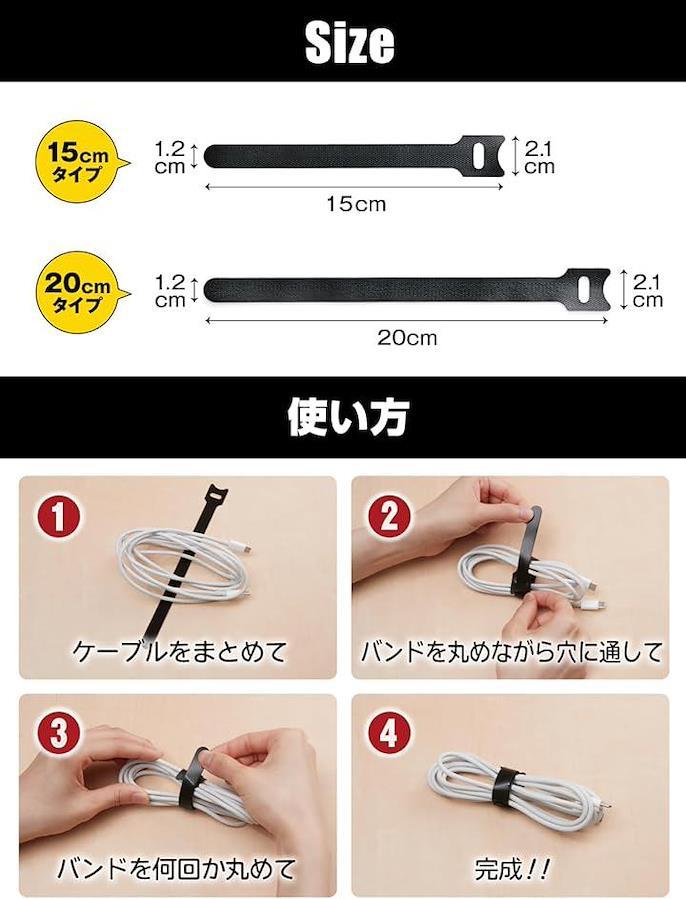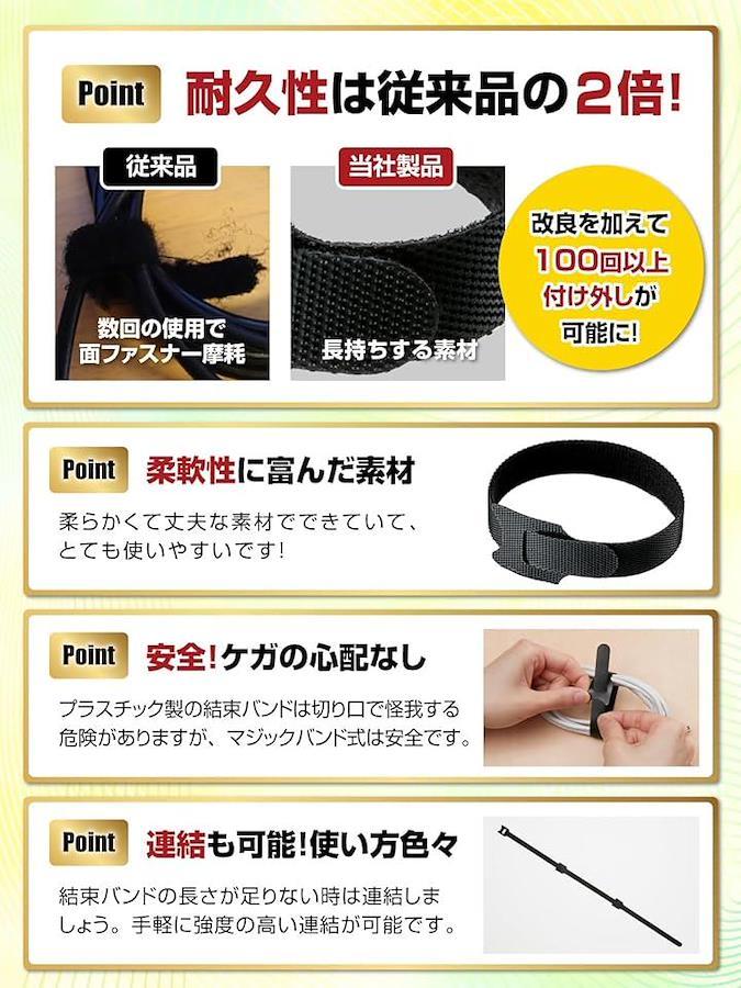 「耐久性は従来品の2倍。」 従来品は数回の使用で面ファスナーが摩耗してしまいましたが、改良を加えて100回以上付け外しが可能に。繰り返し使えるコスパの良いケーブルバンドです。「安全に使える」プラスチック製の結束バンドは切り口で怪我する危険がありますが、マジックバンド式はその心配がなく安心。