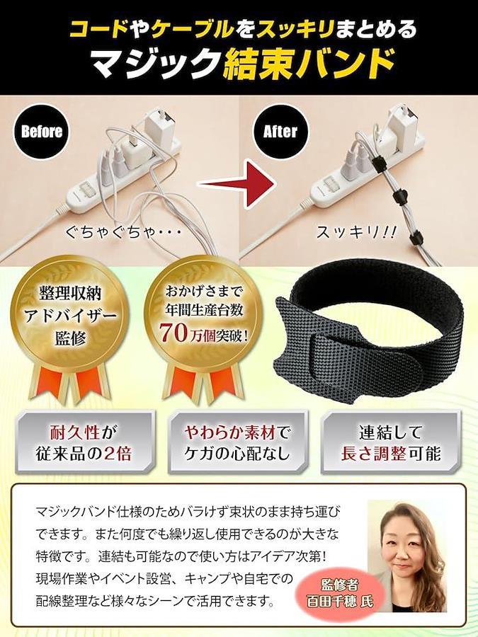 「整理収納アドバイザー監修。マジック結束バンド」 「充電器やデスク周りのぐちゃぐちゃな配線をスッキリまとめたい」そんなお悩みを持つ方におすすめ。コードやケーブルをまとめる便利アイテムです。