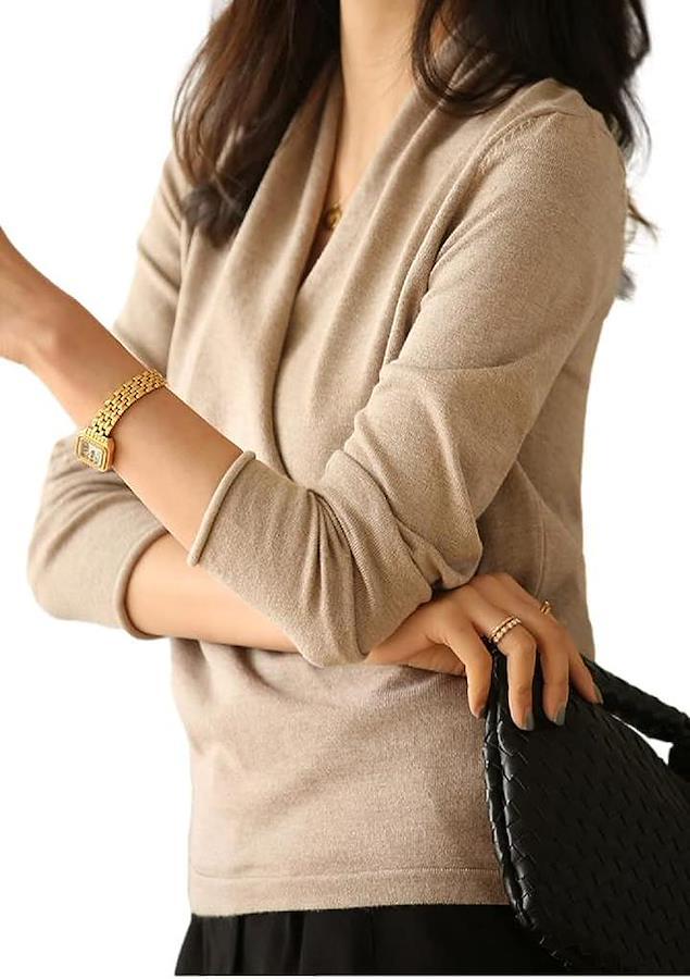 女性らしさが際立つフロントが折り重なったカシュクールデザインの風合い滑らかなニット。