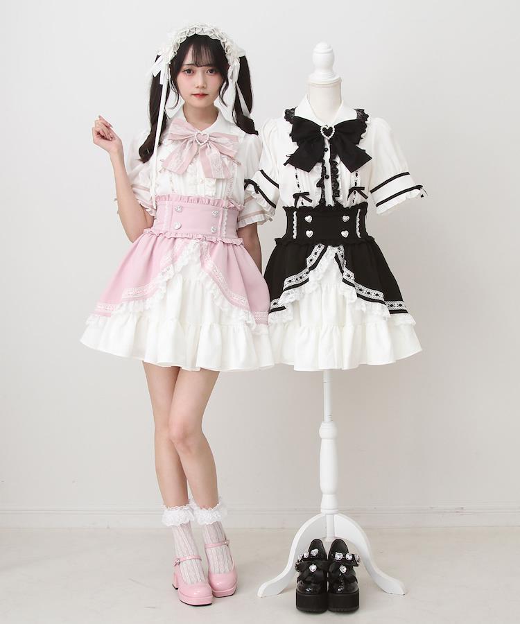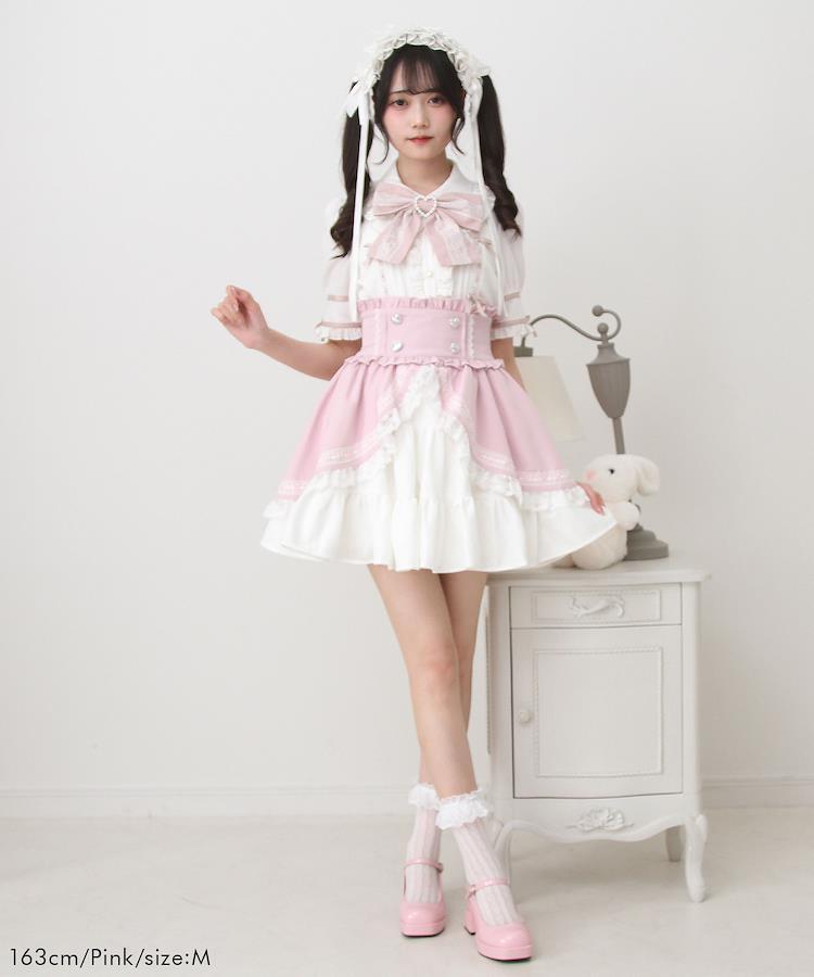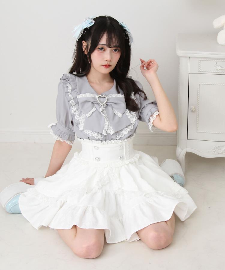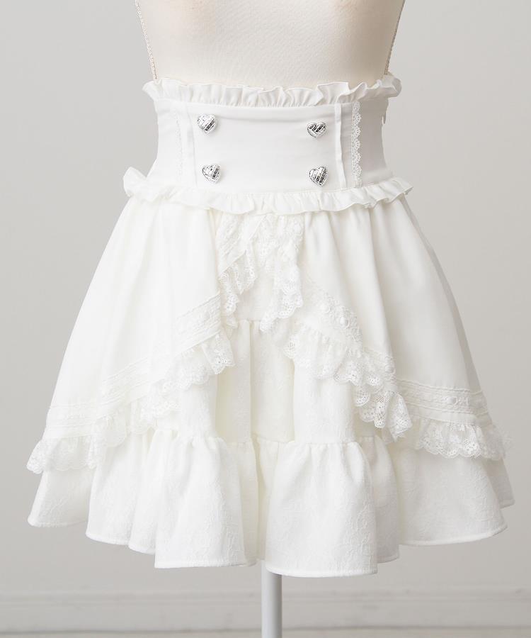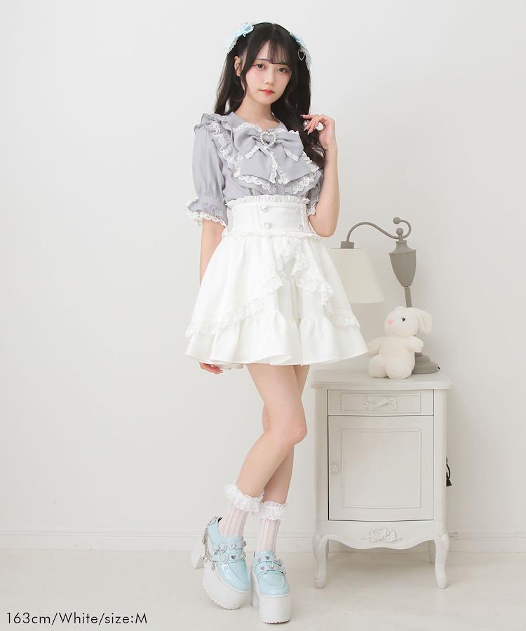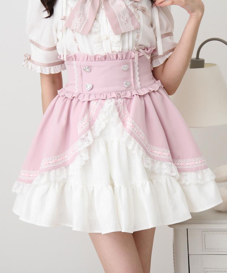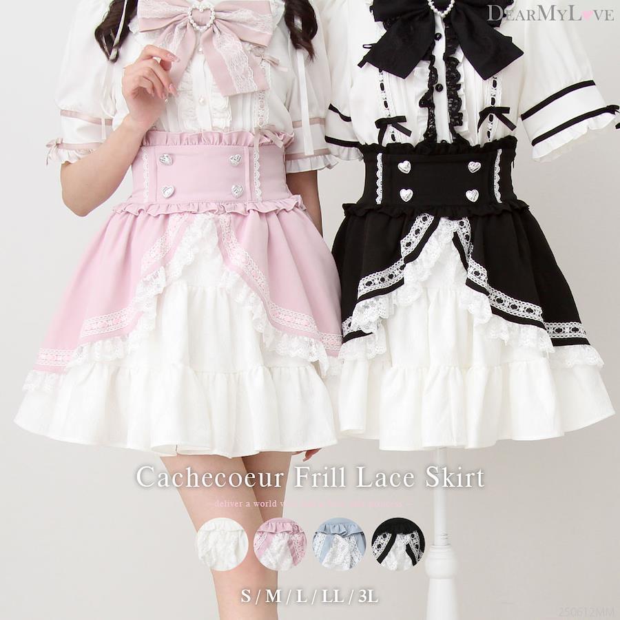 レースたっぷりボリューム感のある甘めカシュクールスカート♪【デザイン】カシュクールデザインに3段ティアードのレース生地がかわいすぎる甘めスカート。ボリューム感のあるシルエット感にハイウエストデザインのメリハリが丁度よく、どこから見てもかわいいデザインに仕上げています。後ろにはかわいいリボンがポイントで付いていて安全ピンで取り外し可能です。カシュクール部分にははしごレースがあしらわれていて、リボンが通っています。レースもたっぷり、リボンたっぷり、こんなにかわいいスカートはDearMyLoveだけ♪【素材】しっかりとした生地感です。裏地付き。脇ポケット付きです。【コーディネート】丸襟やフリルたっぷりの甘めデザインのブラウスにぴったり♪ふわっと広がるデザインがかわいくどんなコーデも主役級に映えます。《透け感》なし 《生地の厚さ》普通 《裏地》あり 《伸縮性》なし《生産国》中国