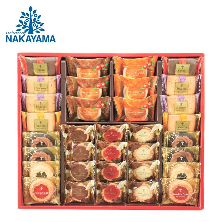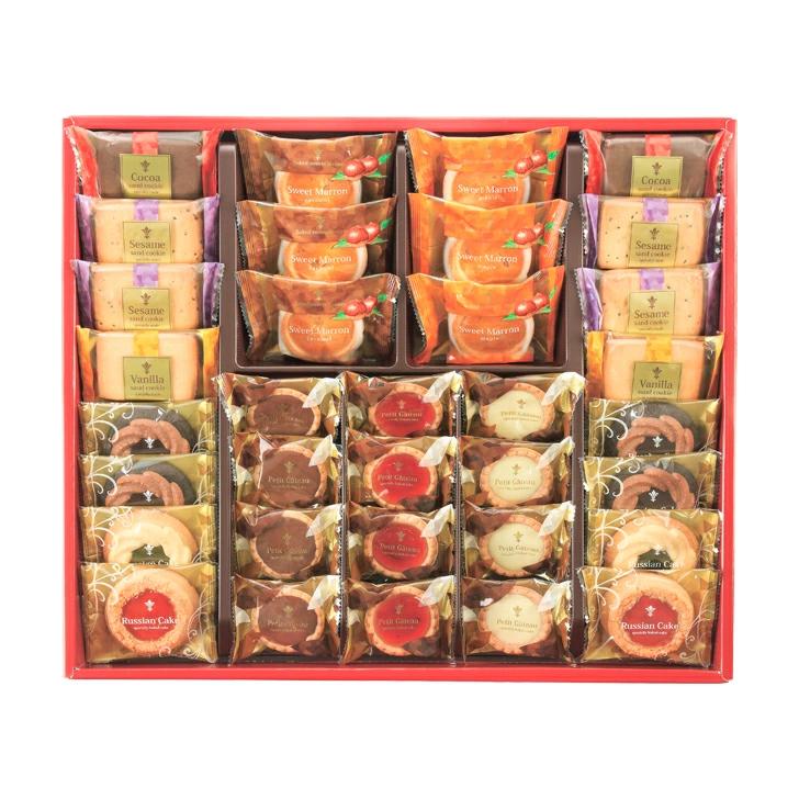 ロシアケーキ(マカロンストロベリー、フラワーキウイ×各2、リッチビター×3)、プチガトー(ストロベリー、オレンジ×各2、ブルーベリー、ミルクチョコ、ホワイトチョコ×各1)、サンドクッキー(ココア、バニラ、セサミ×各2)、スイートマロン(メープル、キャラメル×各3)