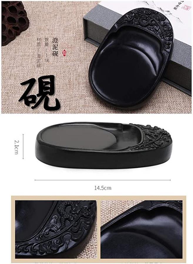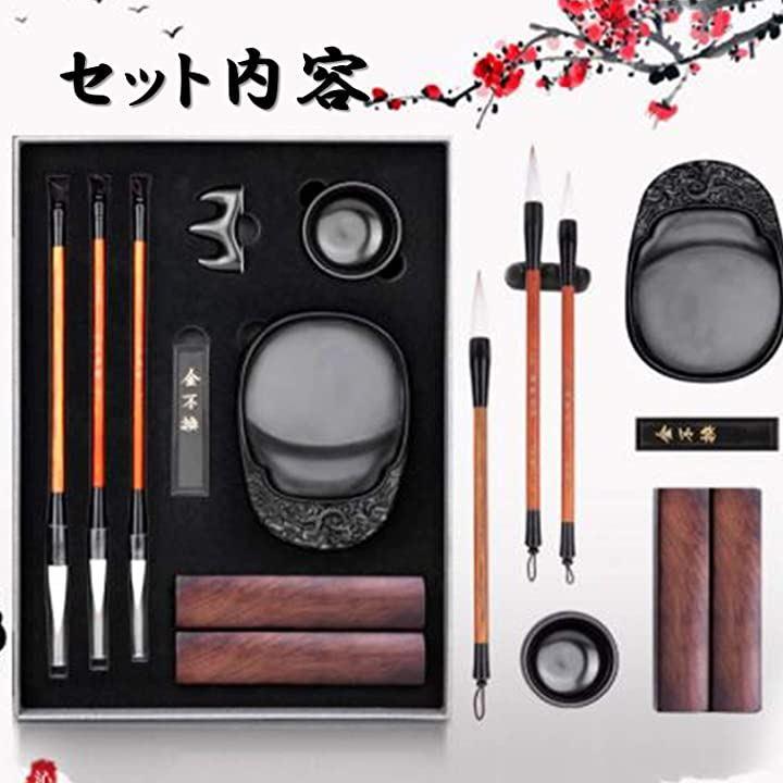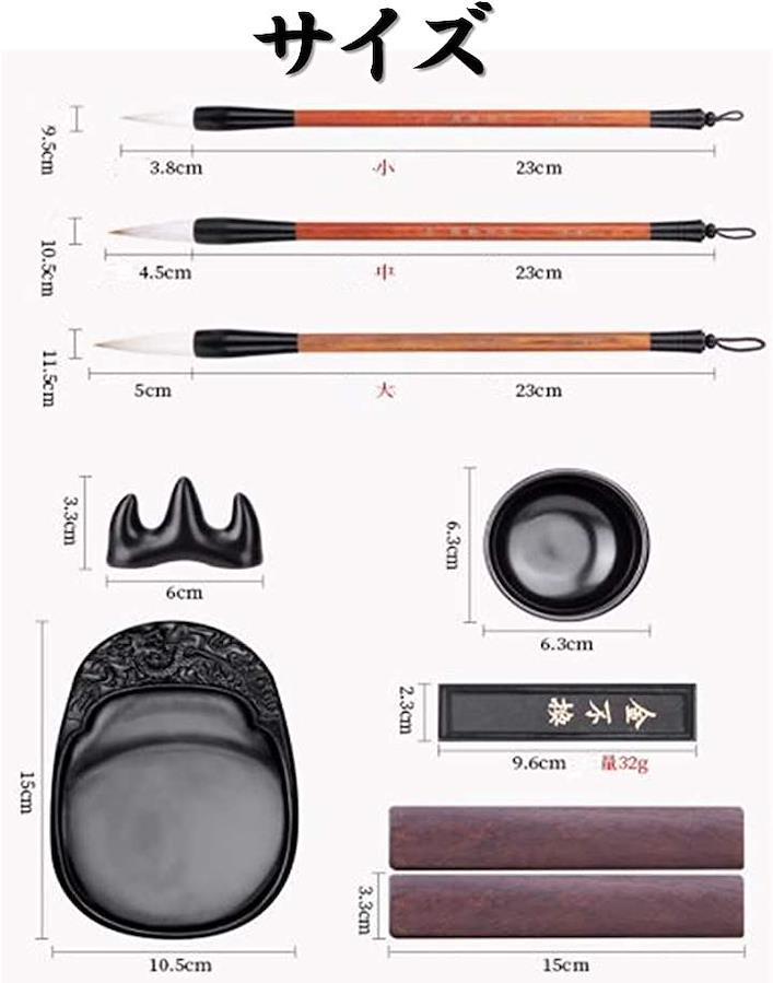 ・サイズ:(硯)約15x10.5cm (筆)全長約23cm、(墨)約9.6x2.3cm、(文鎮)約15x3.3cm、(筆置き)約6x3.3cm、(水差し)直径約6.3cm、 セット内容:硯、太筆、中筆、小筆、墨、筆置き、水差し、文鎮x2本、 原産国:中国