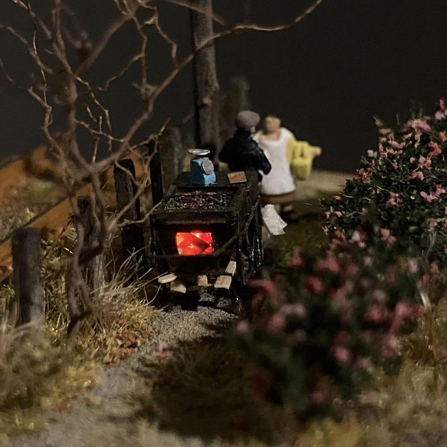 リヤカーと屋台、電柱等人形以外全て手作り。木製台座とケース台座はビス止め。ケース台座にも電飾電源にアクセスできるよう穴あけ加工済み。