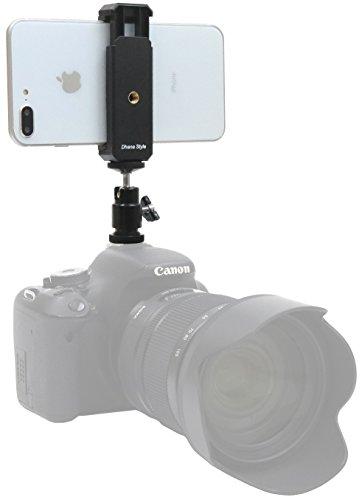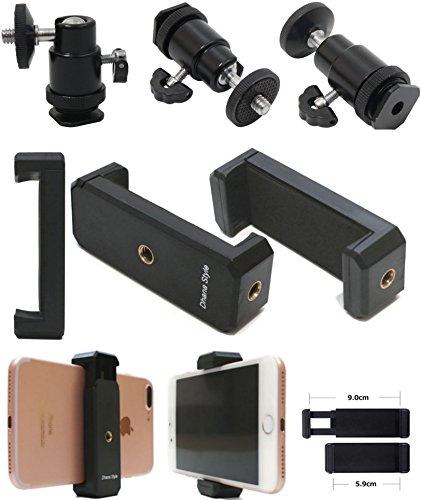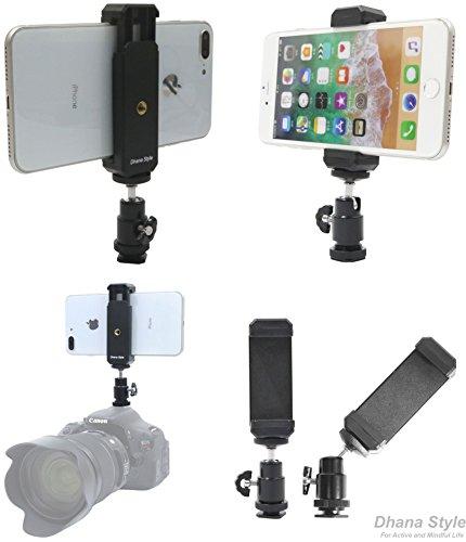 ホットシュー取り付け可能 ボールヘッド (シュー マウント 対応アダプタ 自由雲台) と ボールヘッドに装着可能なスマートフォン ホルダーのセット商品です。iPhone やアンドロイド機種などのスマホを一眼レフ・ミラーレス デジタルカメラのホット シューに取り付けて撮影を行うことが出来ます。スマホで動画を撮りながら一眼レフやミラーレス デジカメでの撮影をしたり、WIFI搭載の一眼レフでは撮影した画像や映像をスマホでその場でチェックしたりトリミング編集したりする事も出来るようになります。【シューマウント 自由雲台 仕様】長さ;6㎝, 重さ;35g, 取付ネジ;1/4 インチ, 底面ネジ穴;1/4インチ, 耐荷重;450g ---> 360° 角度調整 パノラマ回転設計、ツマミで角度を自由に調整できます。アクションカメラ マウント変換アダプター(別売)を用いればGoPro ( hero series), LEVIN , MUSON , Xiaoyi , SJCAM , DBPOWER , AKASO, Vemico, Campark, Wimius, EKEN, APEMAN, Victure, DAPING など ゴープロ マウント互換タイプの スポーツ カメラ (ウェアラブルカメラ)をセットして動画を撮りながら写真撮影を行うことも出来ます。Canon / Nikon / Pentax / Panasonic / Olympus DSLR (一眼レフ デジタルカメラ) に対応 ※コニカミノルタ及びソニー製一眼レフカメラ(αシリーズ)のホットシューには対応しません【スマホホルダー 仕様】ネジ穴径;1/4インチ(側面と背面の2か所にありお好みのアングルに応じて使い分けが出来ます) 重さ;約25g 主な材質; ABS (プラスチック) 対応する スマホ幅; 約62?90mm(iPhone X, iPhone 8, 8plus, 7, 7plus, 6, 6plus, Samsung Galaxy S6 S5 S4 S3 Note 4 Note 3,等対応可) *4インチ幅のモデルには対応いたしません (iPhone4, iPhone5, 5S, iPhone SE 等 は対応不可) ---> ご使用のスマホ幅をお確かめ上ご購入下さい 。 スマートフォンをホルダ から取り外すことなくタテ/ヨコ どちらの方向でも装着可能で、本商品以外にもセルカ棒(自撮り棒)、クネクネ三脚、卓上三脚スタンド、ピストルグリップ(ハンドグリップ)など1/4インチ オスネジのある商品でもご使用頂けます。※スマホ ケース (カバー) の形状や材質によってはケースを装着した状態でホルダーへスマホを装着ができない場合があります。 また、サイドの音量ボタン を押してしまった状態でホルダーにスマホ を装着した場合、 ブルートゥース や 無線、有線 での シャッターリモコン や セルカ棒 での シャッタースイッチ が切れない、動画鑑賞などで音声が出ない、といった現象の原因となります。そのような不具合が生じた場合には スマホの音量ボタンを押した状態で機器をホールドしていないかどうかをお確かめ下さい。*Dhana Style は登録商標です(称呼:ダナスタイル)