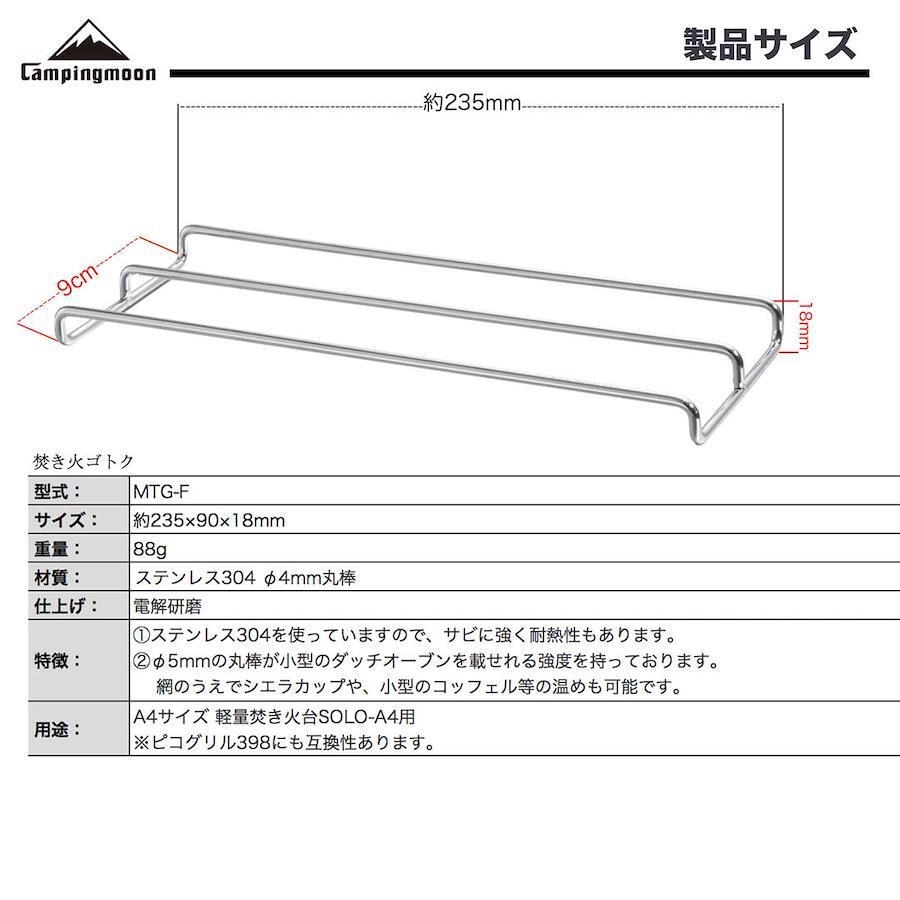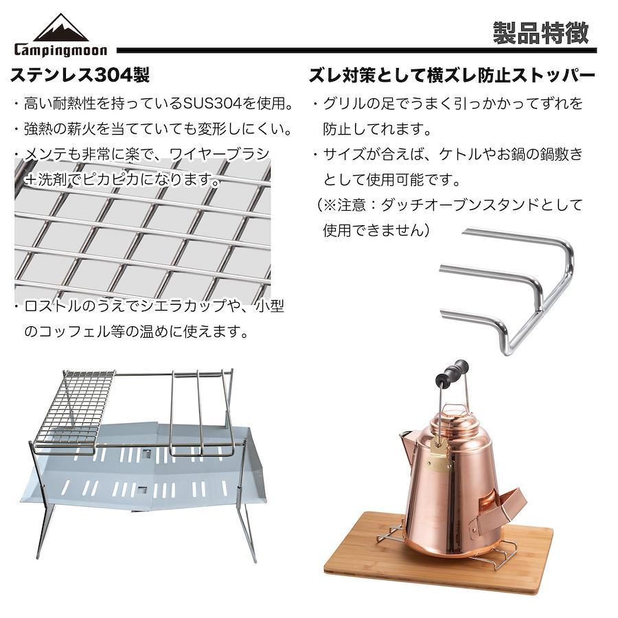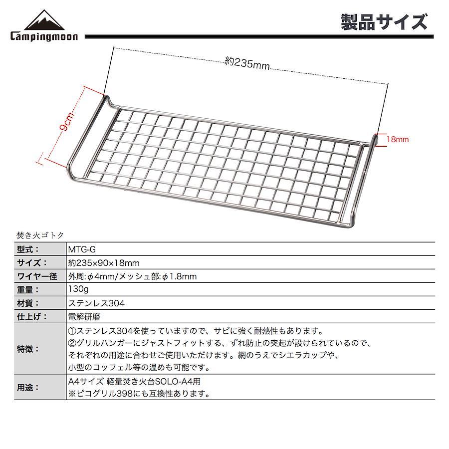 総重量:(約)220g/セットサイズ:約235×90×18mm材質:ステンレス鋼304特徴:①ステンレス304使用 ②グリルにジャストフィットする、ずれ防止の突起が設けられている用途:A4サイズ 軽量焚き火台SOLO-A4用 ※ピコグリル398にも互換性あります。