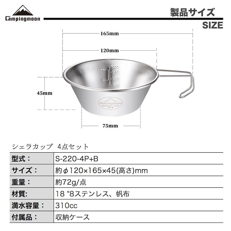 CAMPING MOON Camping Cup Stainless Steel Sierra Cup 310ml 4-Piece Set with Storage Case S220-4P+B