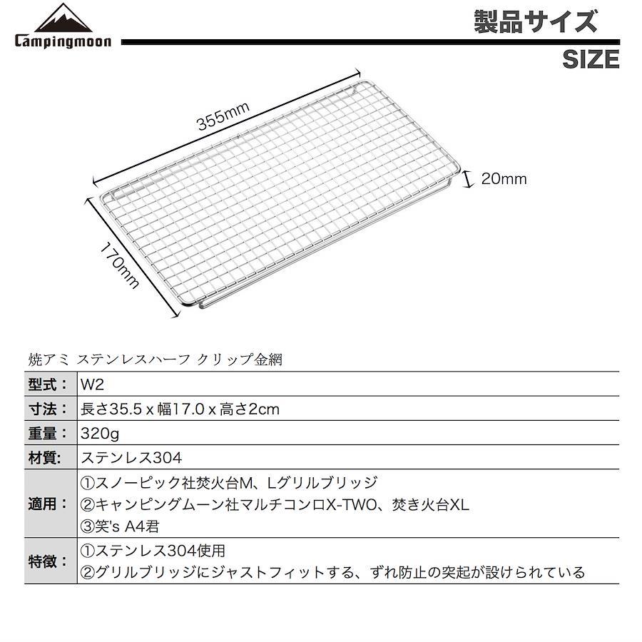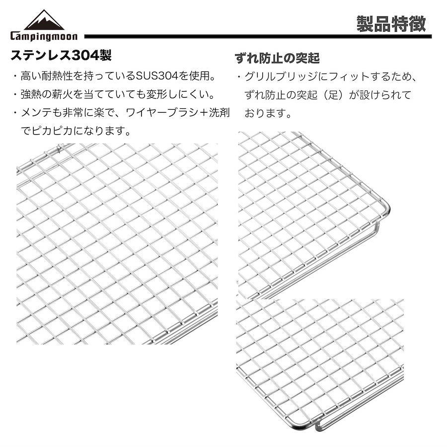 材質:ステンレス304寸法:35.5 x 17cm重量:320g特徴:①ステンレス304使用 ②グリルブリッジにジャストフィットする、ずれ防止の突起が設けられている適用:①スノーピック社焚火台M、Lグリルブリッジ②キャンピングムーン社マルチコンロX-TWO、焚き火台XLグリルブリッジ