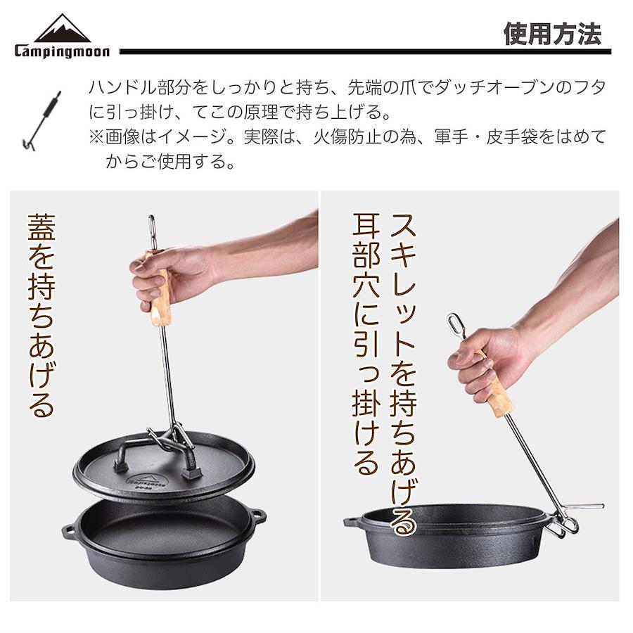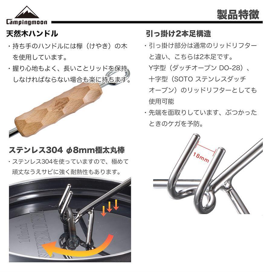 重量: 224g寸法:L360mmx110mmx58mm(Φ8mm極太丸棒)材質:ステンレス304適用:熱くなったダッチオーブンの蓋やスキレットを持ち上げる用特徴:①ステンレス極太無垢丸棒と天然木を使った高品質のリフター。 ②Y字型(ダッチオーブン DO-28)、十字型(SOTO ステンレスダッチオーブン)のリッドリフターとしても使用可能