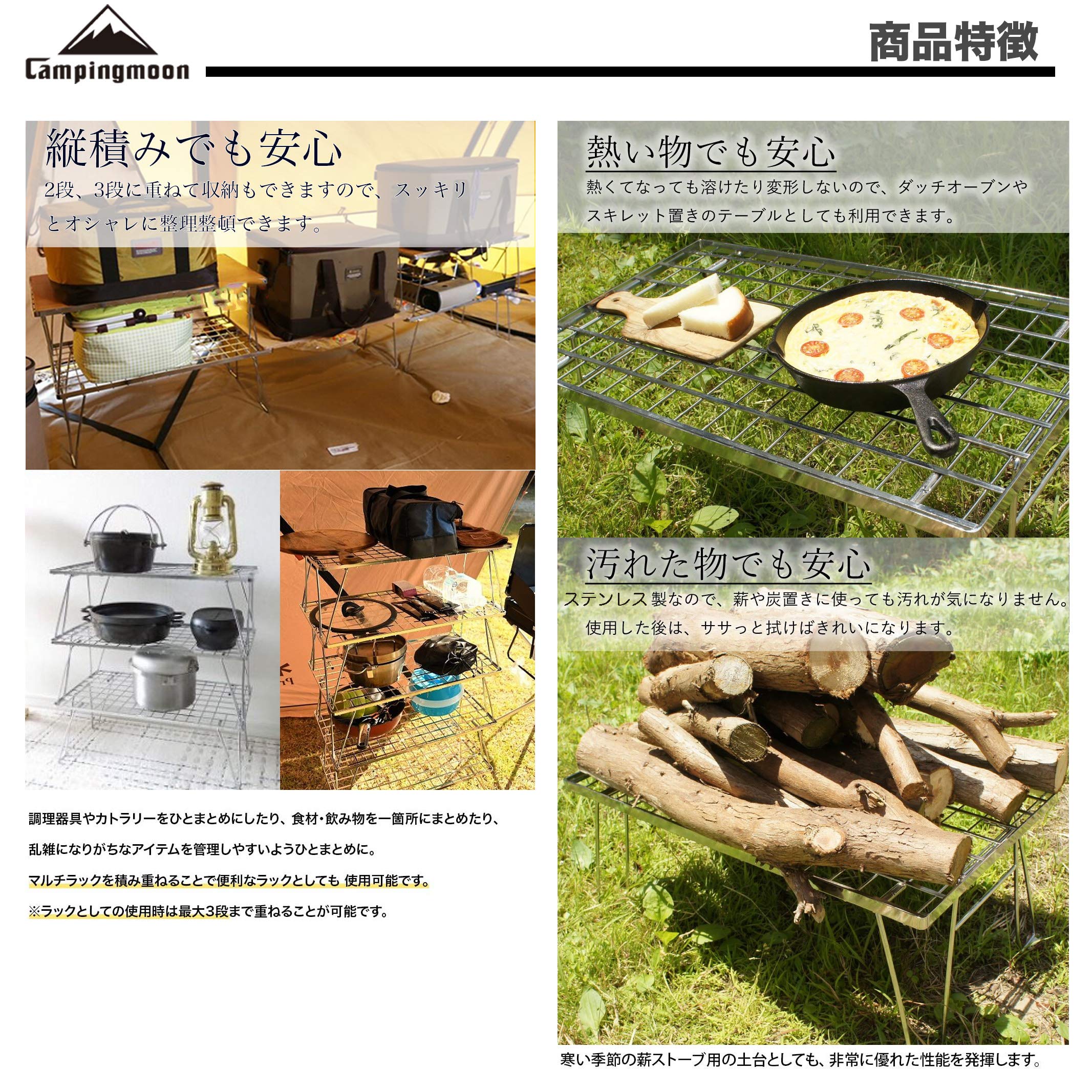 材質:オールステンレス(収納バック材質/900Dバリスティックポリエステル)サイズ(使用時):約60×35×45cm(h)サイズ(収納時):約60×35×5cm重量:約4.1kgセット内容:フィールドラックT-230A×2点、収納ケースB-230×1点