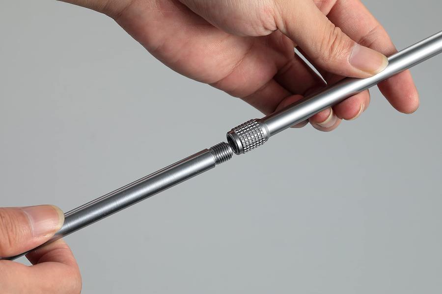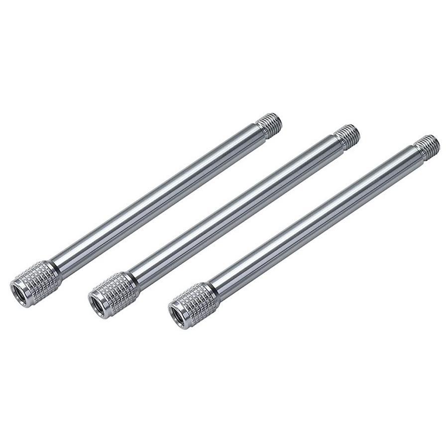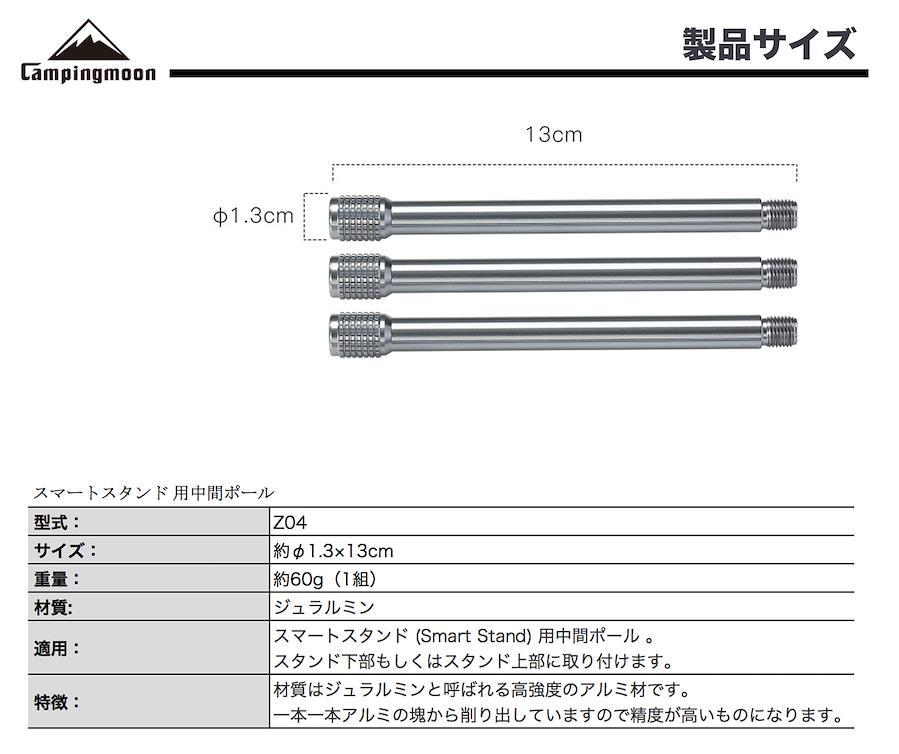スマートスタンド (Smart Stand) 用中間ポール、3本(1組)のセット品です。スタンド下部もしくはスタンド上部に取り付けて、高さを伸ばせることができます。材質はジュラルミンと呼ばれる高強度のアルミ材です。一本一本アルミの塊から削り出していますので精度が高いものになります。サイズ:約φ1.3×13cm / 重量:約60g(3本/1組)