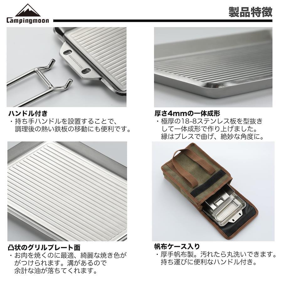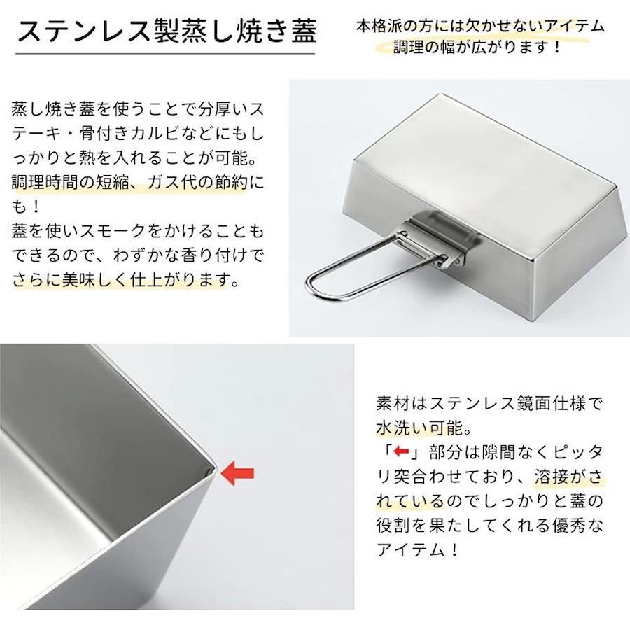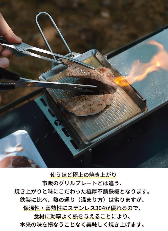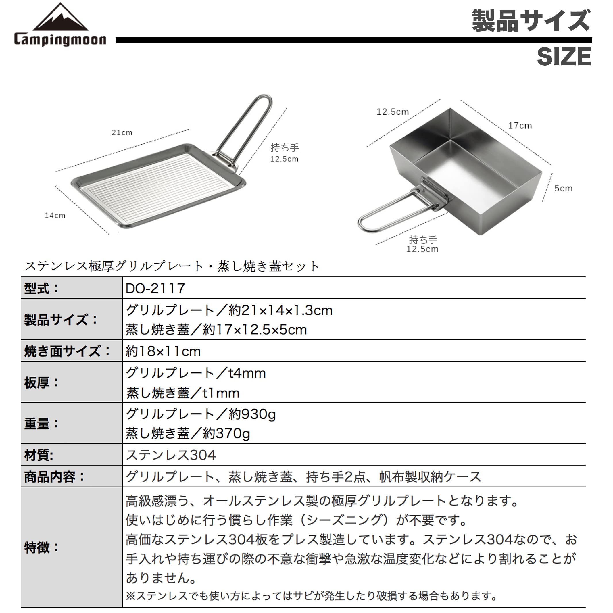 材質:ステンレス304製品サイズ:グリルプレート/約21×14×1.3cm、蒸し焼き蓋/約17×12.5×5cm板厚:グリルプレート/t4mm、蒸し焼き蓋/t1mm重量:グリルプレート/約930g、蒸し焼き蓋/約370g特徴:高級感漂う、オールステンレス製の極厚グリルプレートとなります。 使いはじめに行う慣らし作業(シーズニング)が不要です。 高価なステンレス304板をプレス製造しています。ステンレス304なので、お手入れや持ち運びの際の不意な衝撃や急激な温度変化などにより割れることがありません。 ※ステンレスでも使い方によってはサビが発生したり破損する場合もあります。
