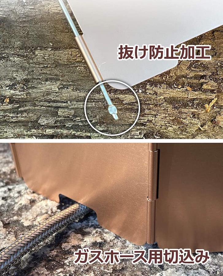 地面にウインドシールドを固定するペグに建てられます。風の強い日や、気温の低い時でも安定した火力が得られます。