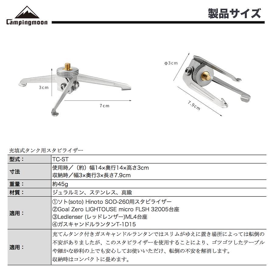 ■サイズ: (展開時)直径140×30mm (収納時)79×30mm■素材:ジュラルミン、ステンレス、真鍮■重量:約46gキャンドルランタンの単体だとスリムがゆえに置き場所によっては転倒の不安がありました。 専用スタビライザーにより、ゴツゴツしたテーブルや細やかな砂利の上でも安心してお使いいただけます。※重要・注意:ポケットタンクTC-25には取り付けできません。収納時にコンパクトに畳めるので、保管に困りません。