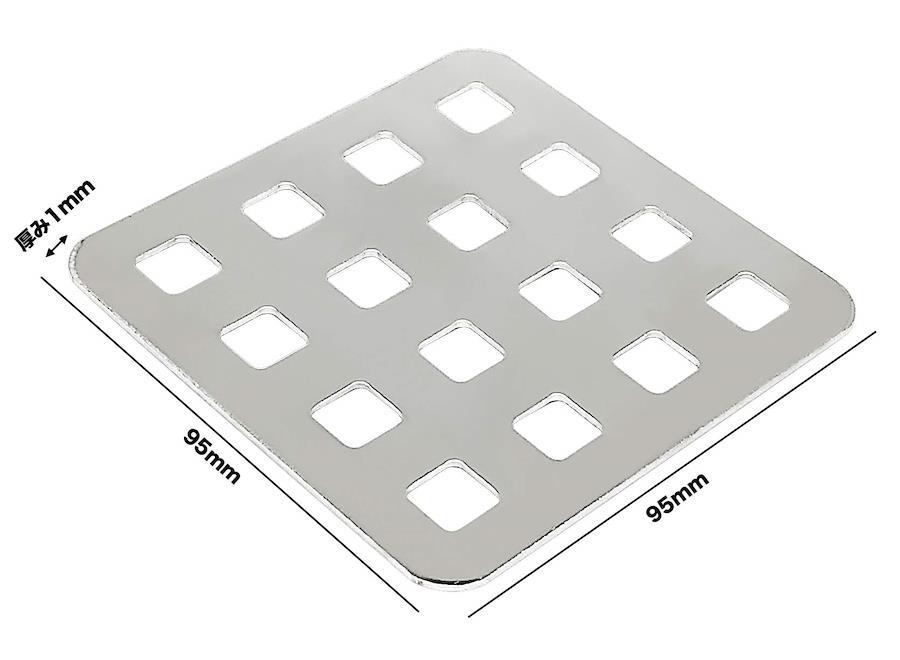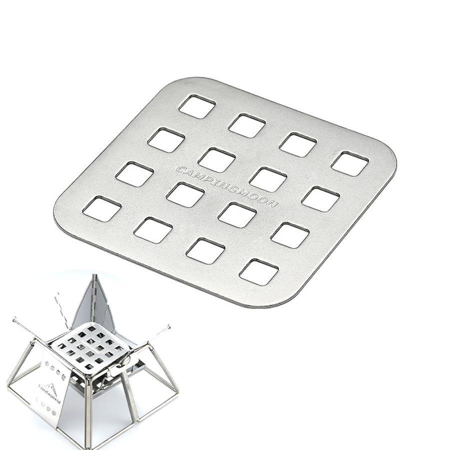 サイズ:約幅9.5cm×縦9.5cm×厚み0.1cm素材:ステンレス重さ: 約0.2Kg適合:小型コンロ(展開寸法が25(幅)x25(奥)cm以下のコンロ)用途:キャンピングムーン社世界最小コンロX-MINI、MT-015FLY、XSサイズコンロX-MINI-Pro.、MT-025FLY用