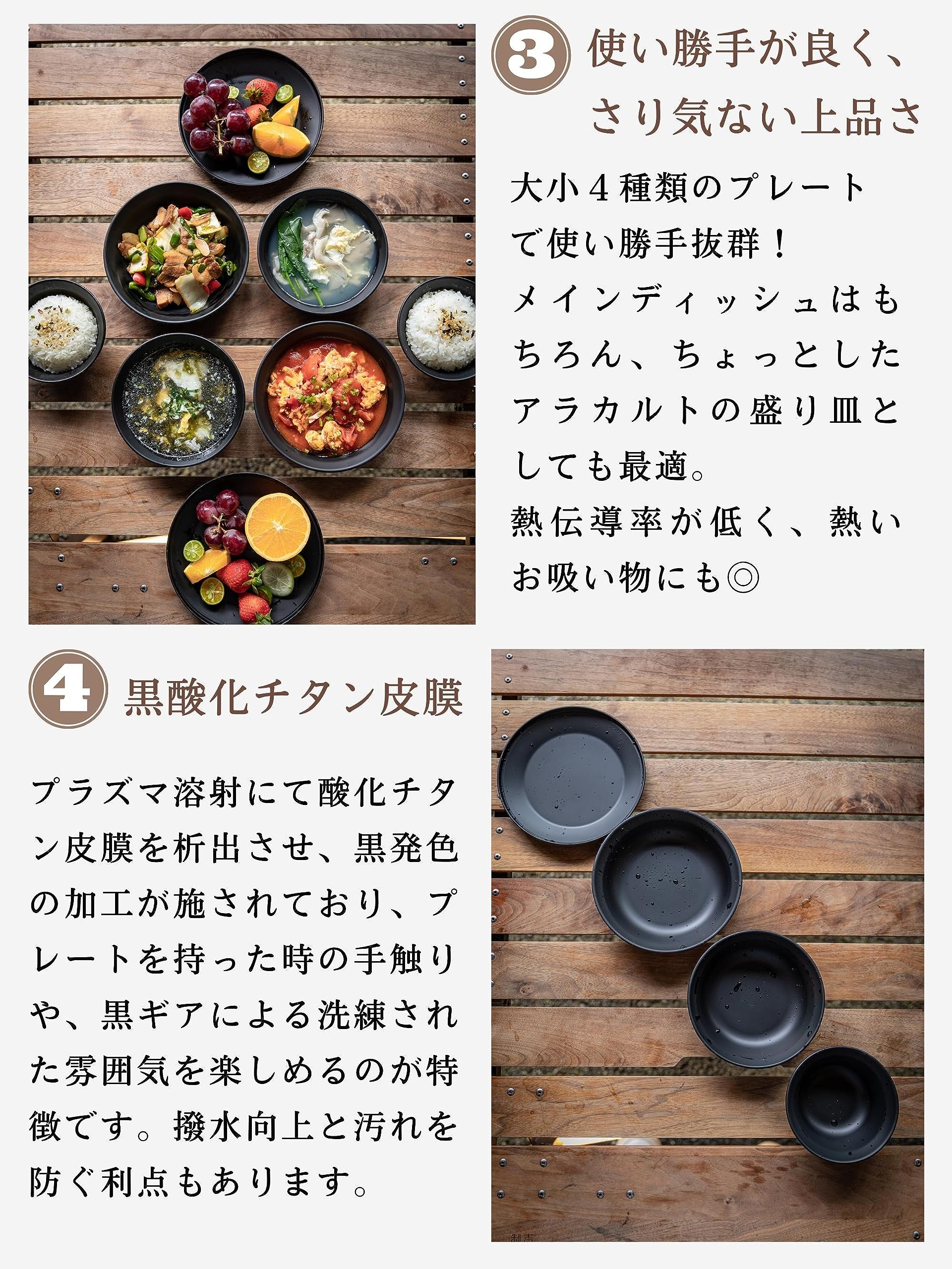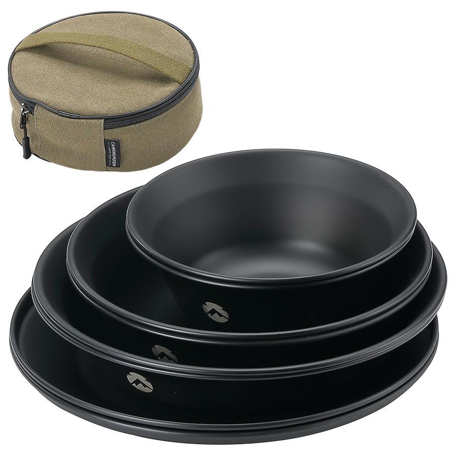サイズ:プレート/約φ175×18mm、デッシュ/約φ168×32mm、中ボール/約φ150×38mm、小ボール/約φ120×45mm重量:プレート/約88g、デッシュ/約89g、中ボール/約73g、小ボール/約54gアウトドア用の食器セットが1つになっているので便利です。おつまみ用から料理の盛り付け用まで色々使えます!商品内容:プレート/2点、デッシュ/2点、中ボール/2点、小ボール/2点、帆布ケース/1点特徴:サイズの異なる4種計8点の食器をオールインワン収納できるテーブルウェアセットです。 素材に0.4mm厚18-8ステンレスを採用し、割れたり溶けたりしないので、アウトドアでも使いやすい!においが残らないのもうれしいポイント。