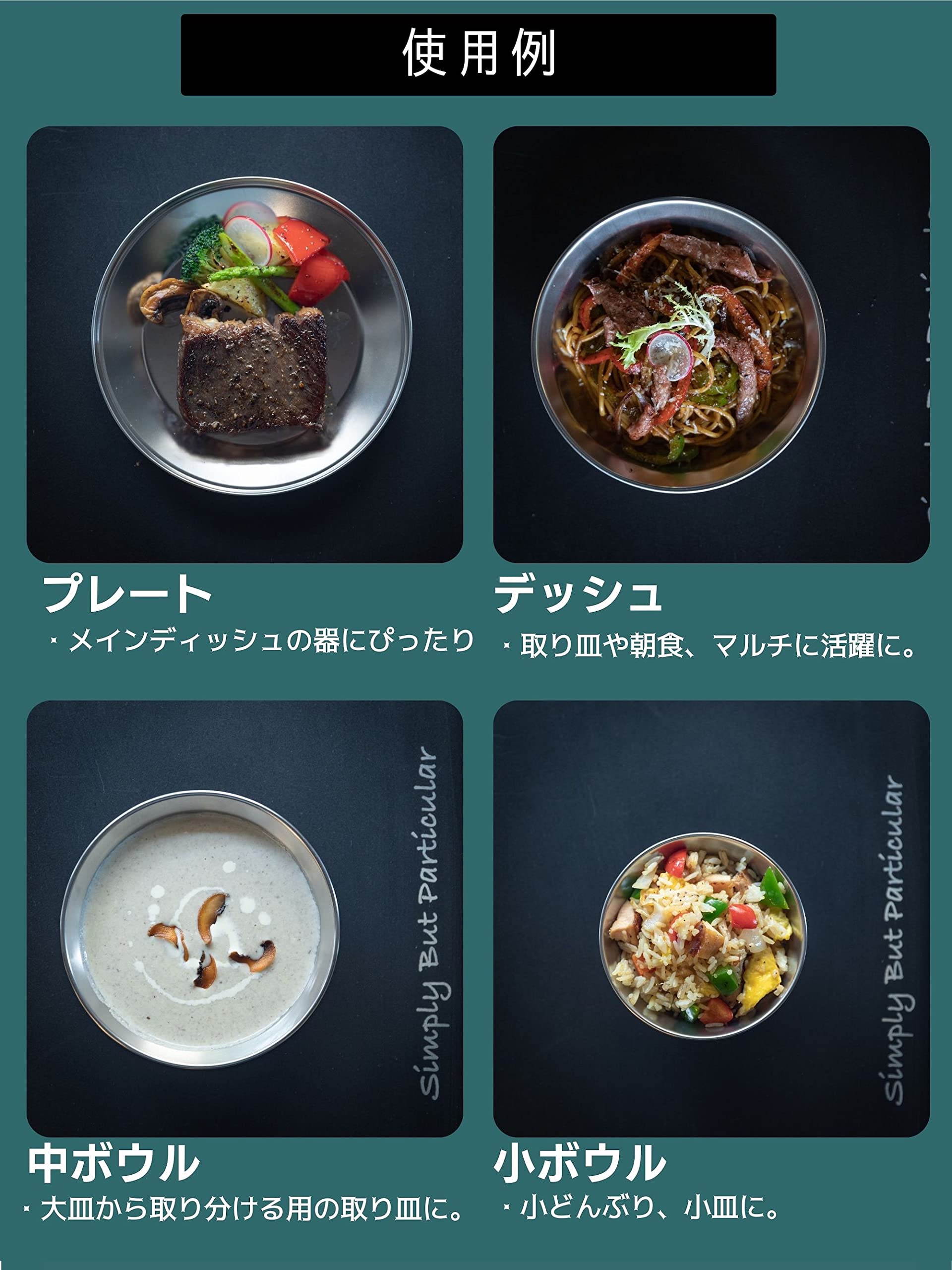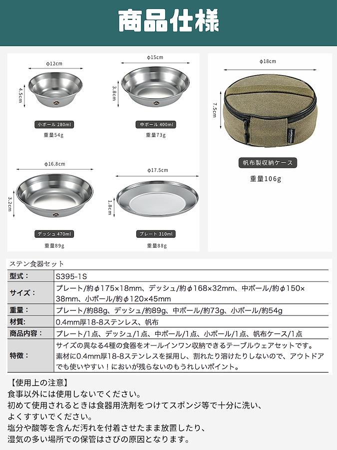 サイズ:プレート/約φ175×18mm、デッシュ/約φ168×32mm、中ボール/約φ150×38mm、小ボール/約φ120×45mm重量:プレート/約88g、デッシュ/約89g、中ボール/約73g、小ボール/約54gアウトドア用の食器セットが1つになっているので便利です。おつまみ用から料理の盛り付け用まで色々使えます!素材:0.4mm厚18-8ステンレス、帆布商品内容:プレート/1点、デッシュ/1点、中ボール/1点、小ボール/1点、帆布ケース/1点