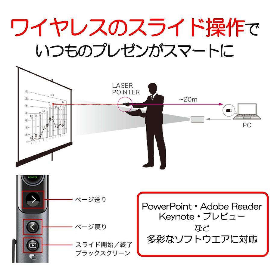 パソコンにUSBレシーバーを接続すればPowerPointやKeynoteのスライド送りも可能。あなたのプレゼンをよりスマートに演出します。また、消費生活用製品安全法(PSC)適合製品ですので、安心してお使い頂けます(レーザー出力クラス2準拠)