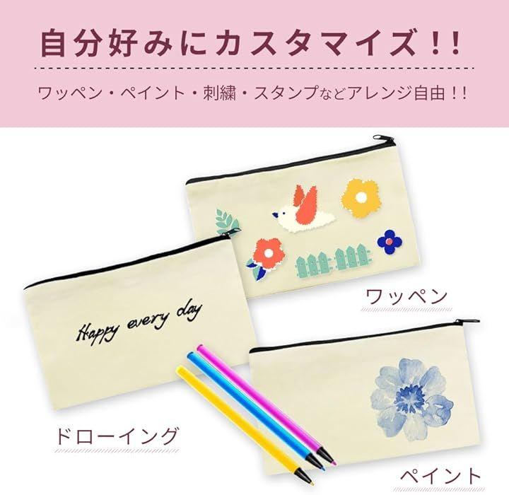 ペンや絵の具を使ってアートを施したり、刺繍や布用ワッペン、スタンプで装飾したりと、自分や家族、友人が喜ぶ個性的なポーチを作り上げることができます。