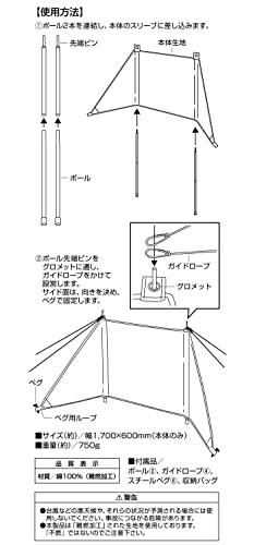 製品サイズ:(約)幅1,700×600mm(本体のみ)製品重量:(約)750g付属品:ポール×2、ガイドロープ×4、スチールペグ×6、収納バッグ×1原産国:中国