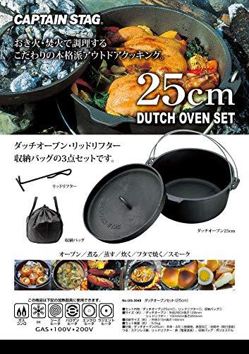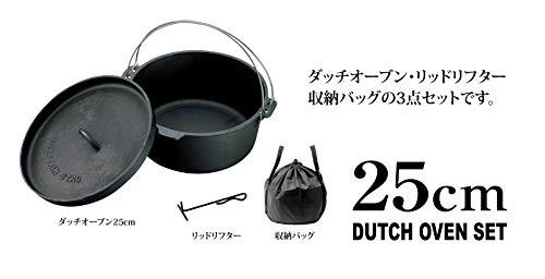 セット内容:ダッチオーブン25cm、リッドリフター、収納バック製品サイズ:(約)ダッチオーブン/外径260×高さ128mm、リッドリフター/100×50×長さ260mm収納サイズ:(約)外径315×高さ145mmセット重量:(約)5.5kg材質:ダッチオーブン25cm/本体・蓋=鉄鋳物、表面加工=油焼き(焼付塗装)、つる=ステンレス鋼、リッドリフター/鉄(電着塗装)、収納バック/ポリエステル原産国:中国