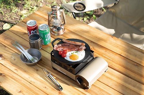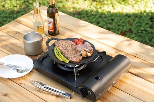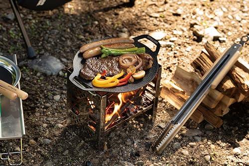 ソロ焚き火台・ジュニアタイプガスカセットコンロで使えるミニサイズの焦げつきにくいグリルプレート。薄くて軽く、熱伝導が良いアルミ製。軽くて丈夫で長持ち、錆びにくい。蓄熱性の高い鋳物製で、熱がムラなく均一に。