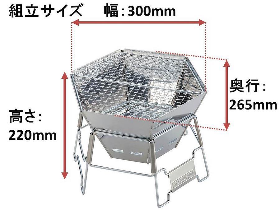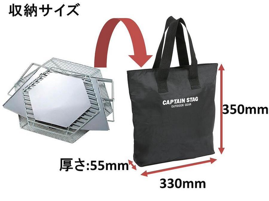 バーベキュー コンロ / 焚火台付属品: 専用バッグ組立サイズ: (約)幅300×奥行265×高さ220mm収納サイズ: (約)350×330×厚さ55mmアミサイズ: (約)285×255mm材料: 本体・底板:ステンレス鋼、バーベキュー網・目皿・スタンド: 鉄(クロムめっき)特徴1: バーベキュー 焚火が楽しめる1台2役のアウトドアコンロ特徴2: 薄型コンパクト収納で便利なキャリーバック付原産国:中国