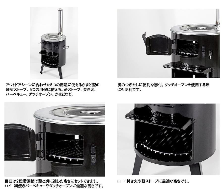 アウトドアシーンに合わせた5つの用途に使えるかまど型の煙突ストーブ5つの用途に使える! 薪ストーブ、焚き火、バーベキュー、ダッチオーブン、かまどなど目皿はハイ・ロー2段階調節ハイ:炭、ロー:薪に適した高さにセット可能蓋は鍋の大きさに合わせて使える組蓋式炭のつぎたしに便利な扉付バーベキューが楽しめる網付
