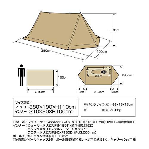 製品サイズ:(約)フライ/380×190×H110cm、インナー/210×90×H100cmパッキングサイズ:(約)66×15×15cm製品重量:(約)3.8kg付属品:ポールキャップ2個、ガイドロープ6本、アルミペグ18本、ポール用収納袋1枚、ペグ用収納袋1枚、キャリーバッグ1枚材質:フライ/ポリエステルリップストップ210T(PU2,000mm)UV加工・撥水加工、インナー/ウォール=ポリエステル185T(通気性撥水加工)、メッシュ=ポリエステルノーシームメッシュ、フロア=ポリスチレンOXF150D(PU3,000mm)、ポール/アルミニウム合金Φ13mm(2本)・16mm(2本)、原産国:中国部門名: ユニセックス大人