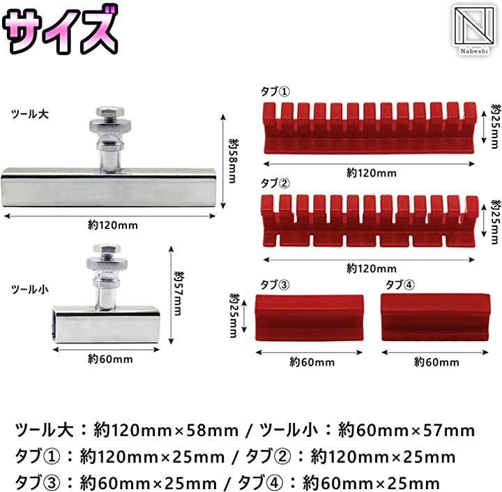 ・「サイズ」ツール大:約120mmx58mm、ツール小:約60mmx57mm、タブ(1):約120mmx25mm、タブ(2):約120mmx25mm、タブ(3):約60mmx25mm、タブ(4):約60mmx25mm