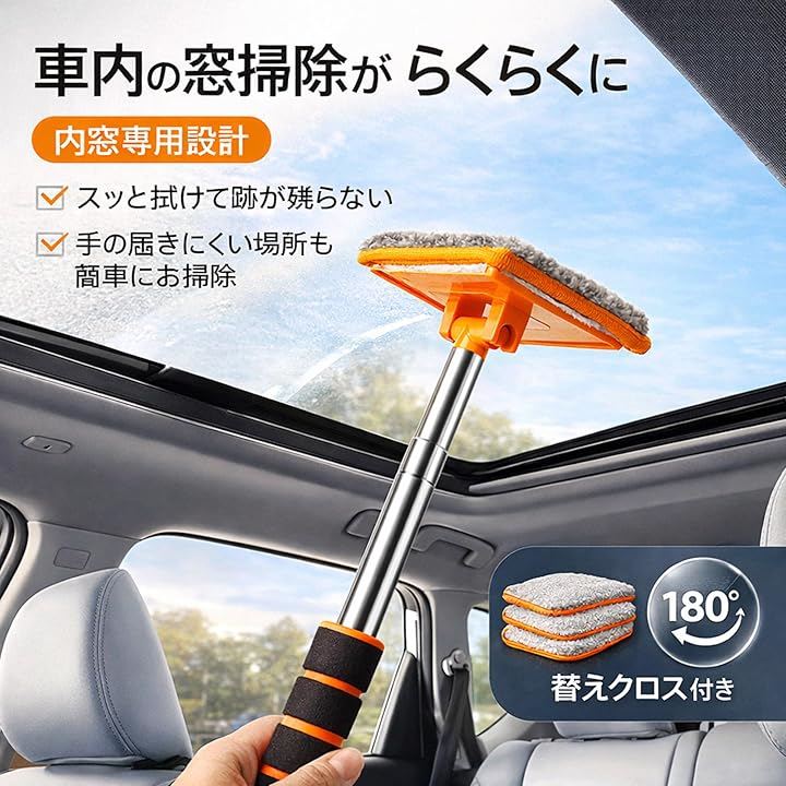 運転席から届きにくいフロントガラスの奥や角度のある部分にもアプローチしやすい設計で、従来のタオル拭きでは残りがちな汚れにも対応します。