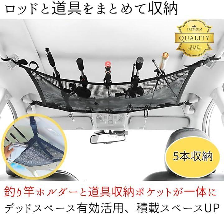 「ロッドと道具をまとめて収納」釣り竿ホルダーと釣り道具の収納ポケットが一体になった車用ロッドホルダー。