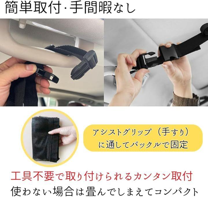 「簡単取付・手間暇なし」取付はホルダーのベルトを車内のアシストグリップ(持ち手・手すり)に通してバックルで固定するたけ。