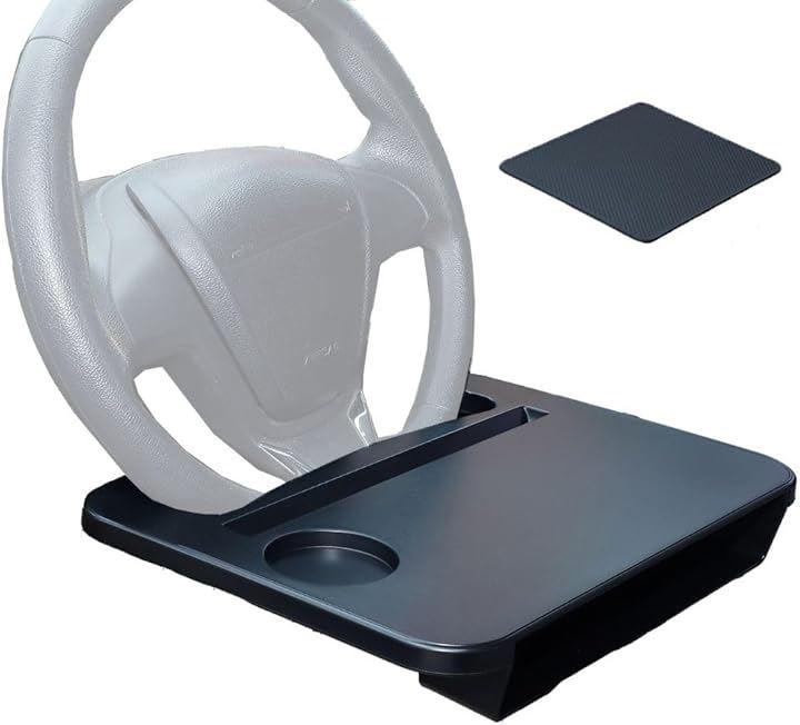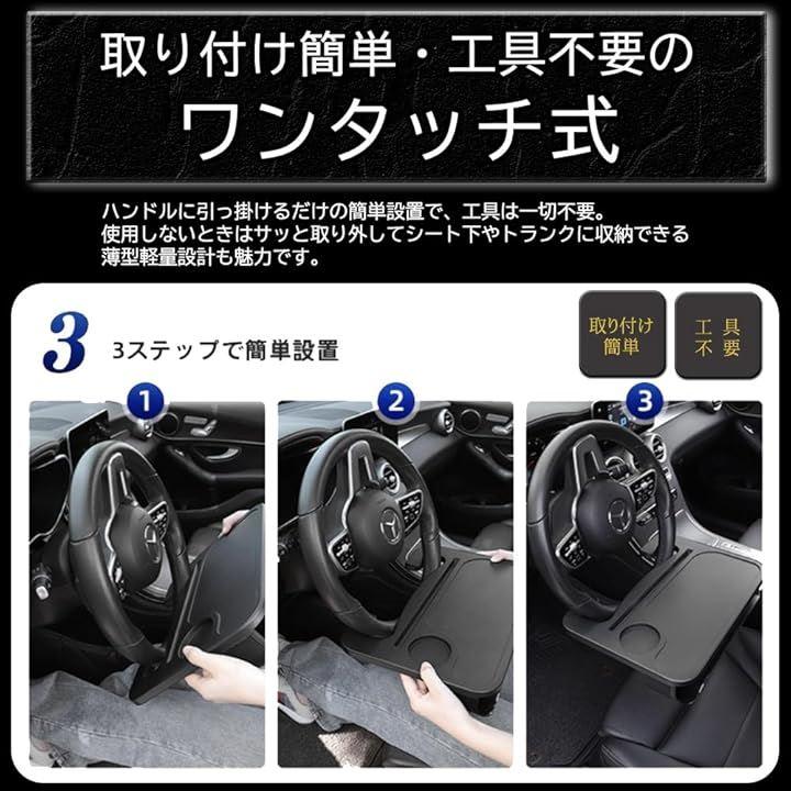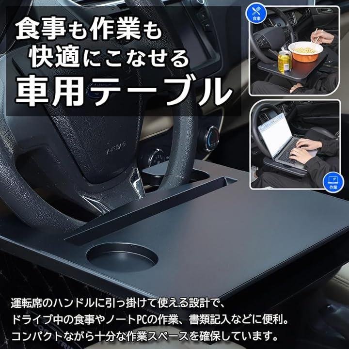 「食事も作業も快適にこなせる車用テーブル」運転席のハンドルに引っ掛けて使える設計で、ドライブ中の食事やノートPCの作業、書類記入などに便利。