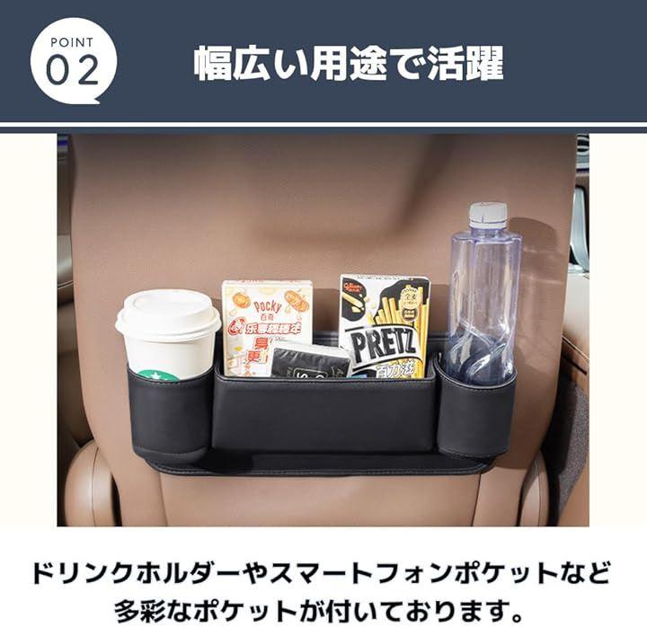「幅広い用途で活躍」シートバックに取り付けるこの収納ポケットは、ドリンクホルダーやスマートフォンポケットなど多彩なポケットが付いております。
