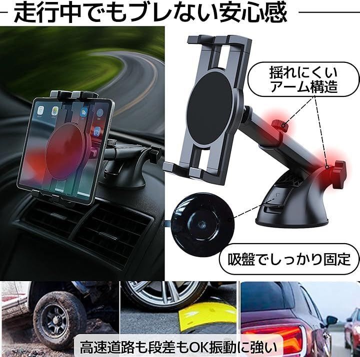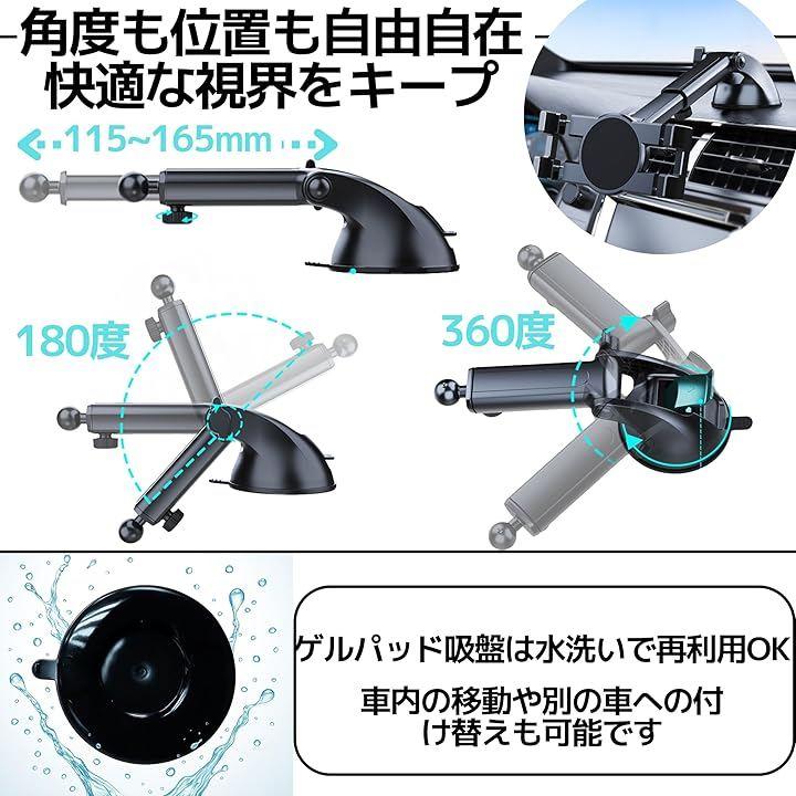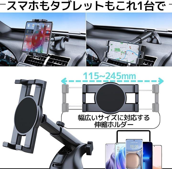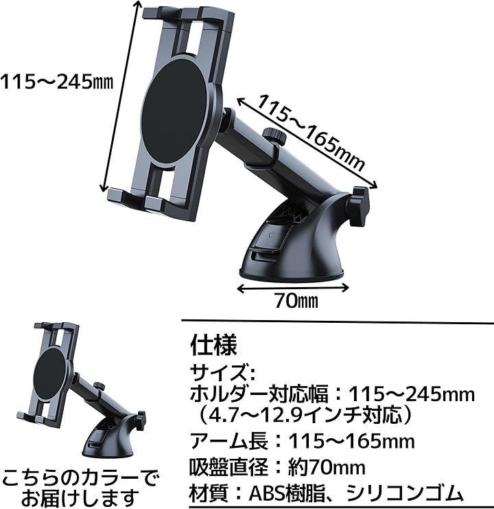 「仕様」 サイズ: ホルダー対応幅:115~245mm(4.7~12.9インチ対応) アーム長:115~165mm 吸盤直径:約70mm 取付方式:吸盤式(ゲルパッド付属) 材質:ABS樹脂、シリコンゴム カラー:ブラック