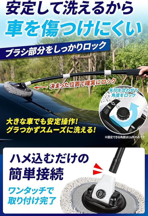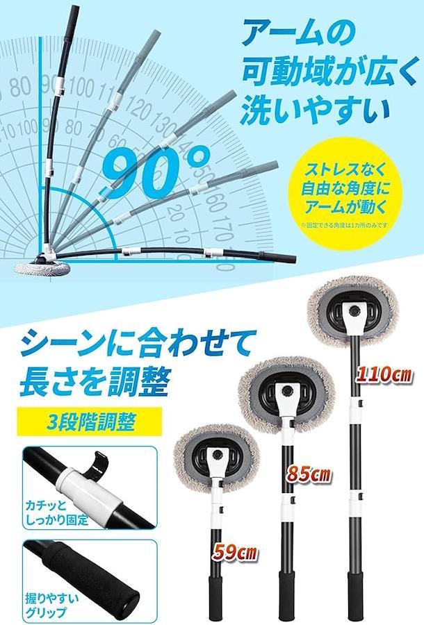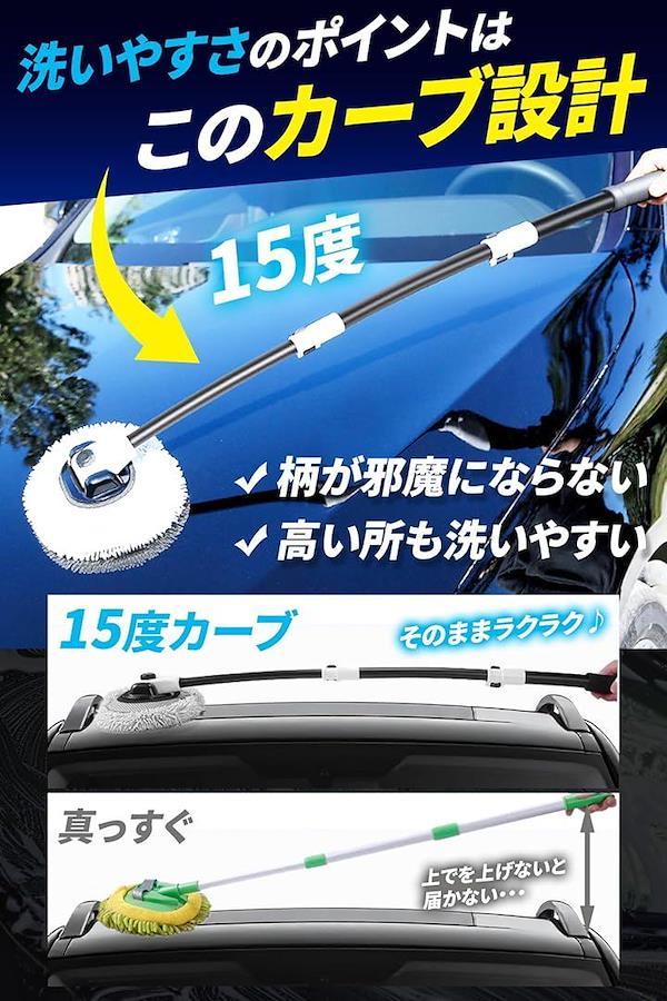 「15度カーブ&90度回転モップヘッドで高所もラクラク」モップヘッドが90度回転し、さらに15度のカーブ設計で車の屋根やフロントガラスなど手の届きにくい部分も簡単に洗車できる洗車モップです。