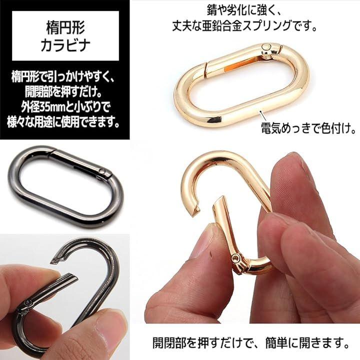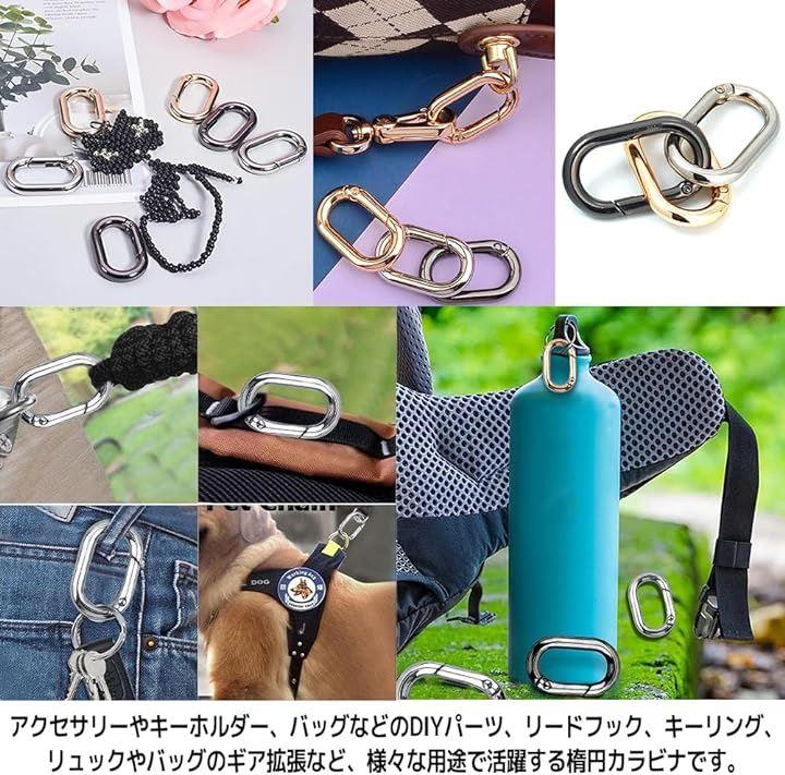 ・アクセサリーやキーホルダー、バッグなどのDIYパーツ、小型犬や猫のリードフック、鍵類をまとめるキーリング、リュックやバッグのギア拡張など様々な用途で活躍する楕円カラビナセットです。