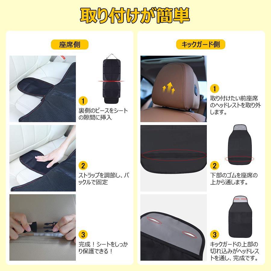 【材質】このチャイルドシートマットの表面は耐久性高い600Dオックスフォードと滑り止めPUで作られ,防水性がよ,マットのバックは滑り止め素材と泡メッシュを採用し、安全性と固定性を向上させる.<br> 【用途】チャイルドシート設置による座席の擦れ、キズ、凹みの防止、裏地の滑り止めでシートのズをこれ一つで実現。防水,耐久性高い材料で作られて、靴に砂や泥が付いても汚れが落ちやすい、汚れてもサッと拭き取れるので 、お手入れ簡単。<br> 【取付け】★マット、長さ調節可能な紐をヘッドレストに取り付けるだけ。座席と背もたれの隙間に差し込むしっかり固定具付きです。 ★キックガード、ゴムバンドでぴったり固定、ヘッドレストの軸に通すだけの簡単設置。<br> 【対応シート】取付は工具不要でママでも簡単装着。ISOFIX規格車対応でほぼ全車種対応。<br> 【対応車種】保護マット、キックガードともチャイルドシートが設置できるほぼ全ての自動車に取り付け可能です。キックガードは取り外し可能な2軸タイプのヘッドレストにのみ対応です。<br>