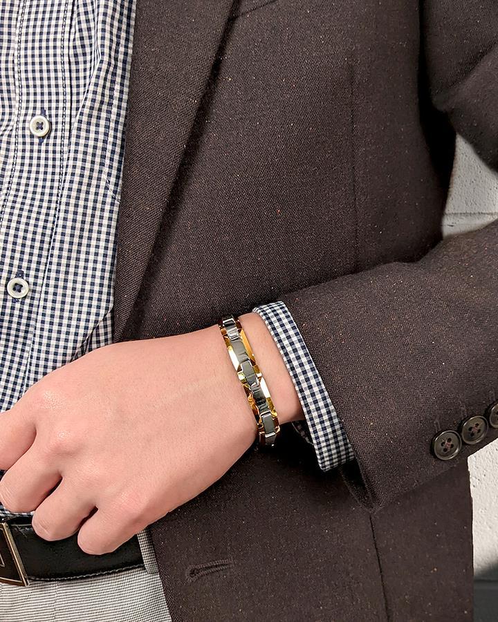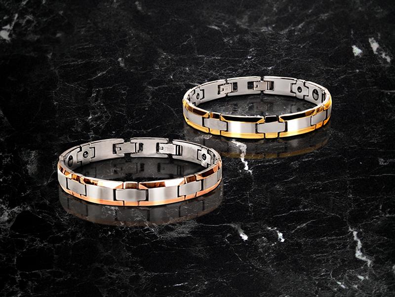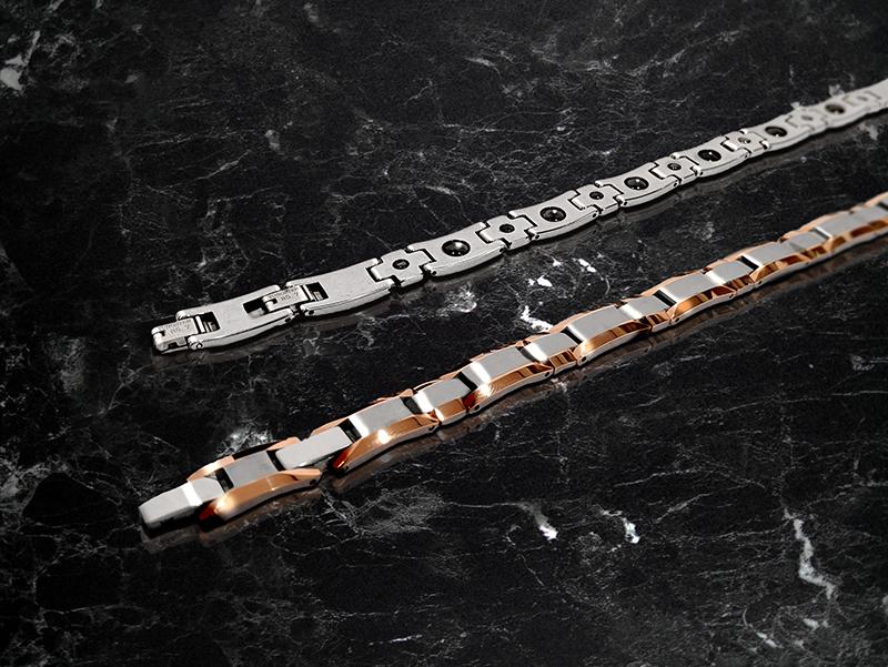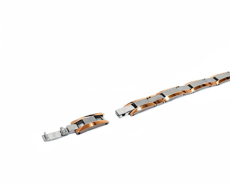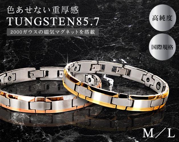 ★重厚感あふれる希少金属「タングステン」を使用したブレスレット!*留め具には「TUNGSTEN85.7」と刻印されており、高純度&国際規格の証です。ワンタッチでコマを外すことができ、19cmと21cmに簡単調節が可能です。*レアメタル「タングステン」とは金とほぼ同比重で重厚感と高級感を兼ね備えた素材です。ダイヤモンドに匹敵するほどの強度を誇り金属の中でもっとも融点が高く宇宙ロケットの部材にも使用されています。人体への影響が少ないことからCT装置に使用されるなど医療分野でも活躍している素材で金属アレルギーを起こしにくく滅多なことでは傷つかない希少金属としても有名です。その強度は50年手入れしなくても輝き続けるといわれており、色あせない重厚感をお楽しみ頂けます。*内側に2000ガウスの磁気マグネットを搭載しており、健康志向の方にも重宝されます。*ゴールドとピンクゴールドの2色をご用意しておりますのでペアでお使いいただくことも可能です。*ベロア調の専用箱に入れてのお届けでプレゼントにも最適です。