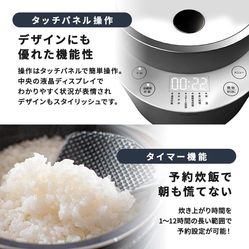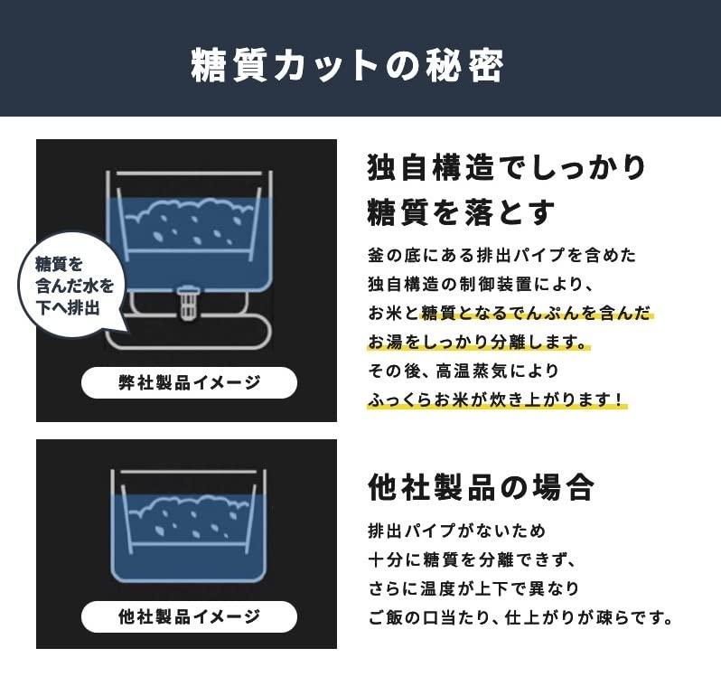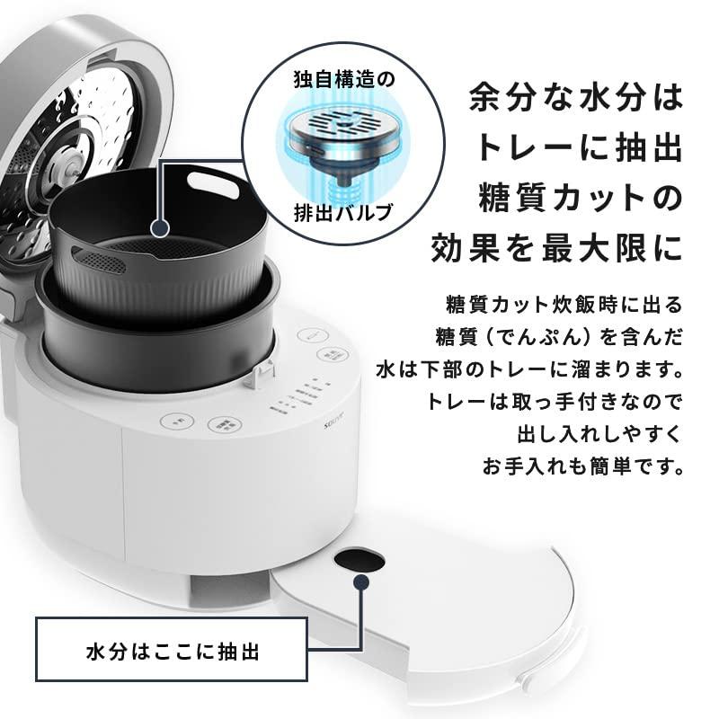 通常1-5営業日で発送:【最大糖質カット】9つの特許取得したこだわりの構造が、糖質を含んだ水を計算して炊飯時にお米から出る糖質(でんぷん)を自動排出します。【5種類の調理モード】通常炊飯、おかゆ、雑穀米、蒸し料理を1台で行なえます。通常炊飯では1回で最大4.5合まで炊飯することが可能です。【蒸気・水滴を抑える釡】糖質カットモードでは、内部のスチームを炊く力に変えることによりほとんど蒸気が排出されなくなります。蒸気に含まれていた水分は、本体後ろの取外し可能な水滴ポケットに溜るので、いつでもお手入れが可能です。【お料理やスープにも使える】糖質カット炊飯時に出る糖質を含んだ水は下部のトレーに溜まります。そのまま捨ててもいいですが、お米の甘みがあるのでスープに活用しても美味しくお召し上がりいただけます。【強力スチームで清潔に】蒸気を利用してベビー用品や乳幼児グッズ清潔に保つことができます。【タッチパネルで簡単操作】予約、保温のタイマーは中央の液晶ディスプレイでわかりりやすく表示され、設定した操作を取り消したい場合は、ボタン長押しで取り消すことができます。炊飯準備時間は、炊飯するお米の量によって異なります。【耐久性のある5層コーティング釡】通常の炊飯釜と糖質カット釜の2種類があり、2種類のお釜には5層のコーティングが施されています。【パーツの取り外しで簡単洗浄】お釜だけでなく多くのパーツが分解可能でお手入れがしやすい構造になっています。2種類のお釜、排出バルブ、トレー、フタ内部、水滴ポケットは、誰でも簡単に分解することができます。細かく分解してお手入れすることでいつでも衛生的にご使用いただけます。【製品仕様】商品名:糖質カット炊飯器(Low Caloriena)、カラー:ホワイト、チャコールグレー 炊飯容量:糖質カット1.5合/通常炊飯4.5合 定格電圧:AC100V 定格周波数:50/60Hz 定格消費電力:500W 予約時間:糖質カット12時間/通常炊飯12時間 保温時間:糖質カット2時間/通常炊飯24時間 外形寸法:約244(幅)×322(奥行)×222(高)㎜ 質量(重量):約3.7Kg コード長さ:約112㎝ 付属品:本体、シリコンマット×2、自立式しゃもじ、専用おたま、軽量カップ、取扱説明書兼保証書