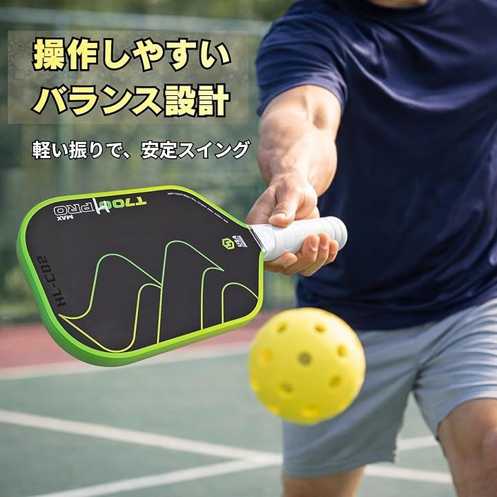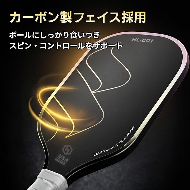 「カーボン製フェイスによるスピン・コントロール性能」本商品は、カーボン素材を使用したフェイス構造により、ボールとの接触時に適度な摩擦を生み出し、スピンをかけやすい設計となっています。