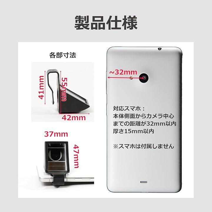 「製品仕様」「対応スマホ形状」厚さ15mm以下、本体の端から32mm以内にレンズのあるスマホに対応「本体寸法」高さ55mm 幅37mm 長さ55mm