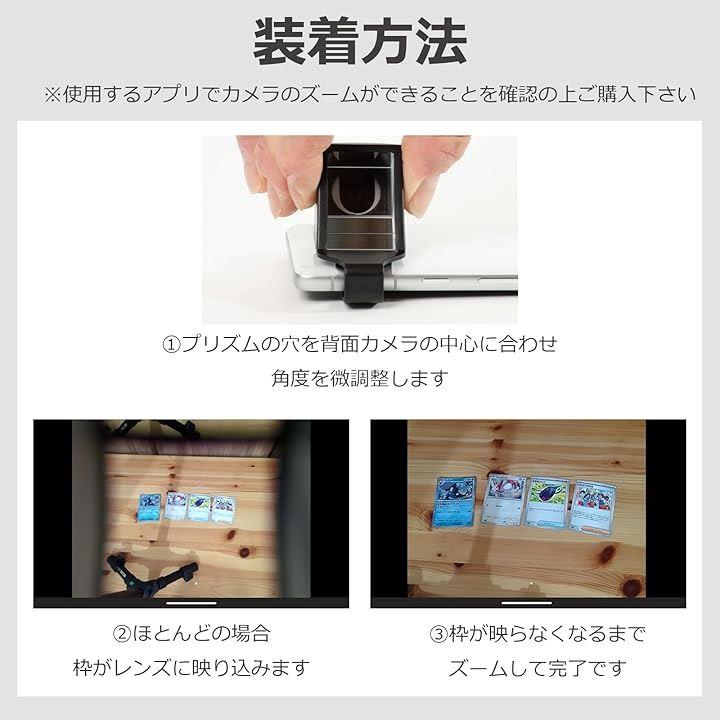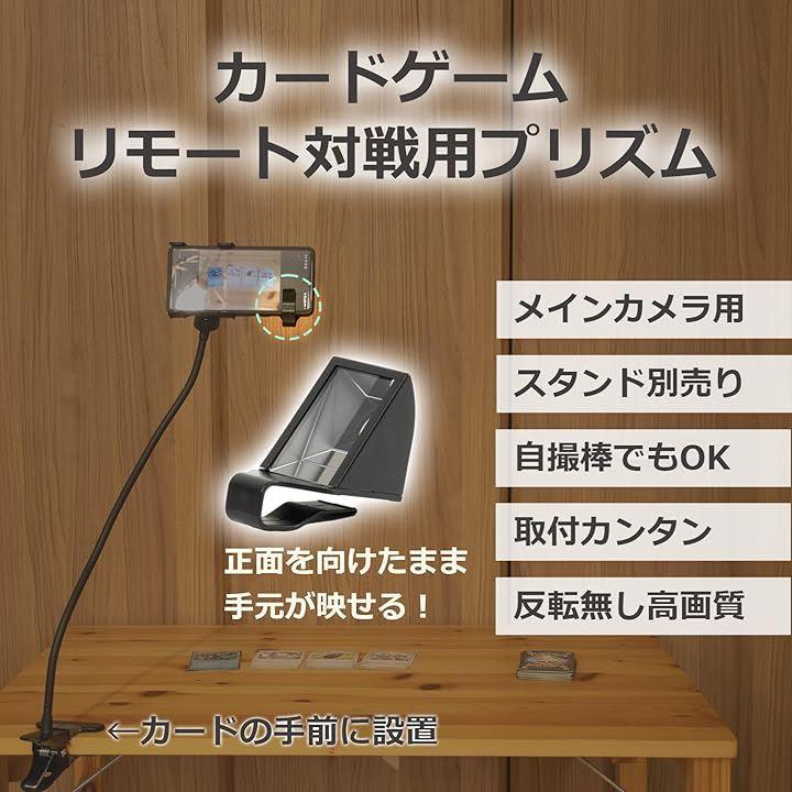 正面を向けたまま下が映せるため、お手持ちのスマホスタンド(高さ50cm以上)や足つき自撮り棒を利用してビデオ通話アプリでカードゲームのオンライン対戦を可能にする角度変更レンズです。