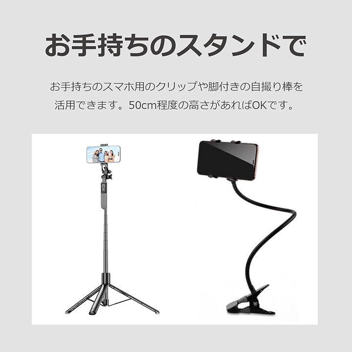 「お手持ちのスタンドで」お手持ちのスマホ用のクリップや脚付きの自撮り棒を活用できます。