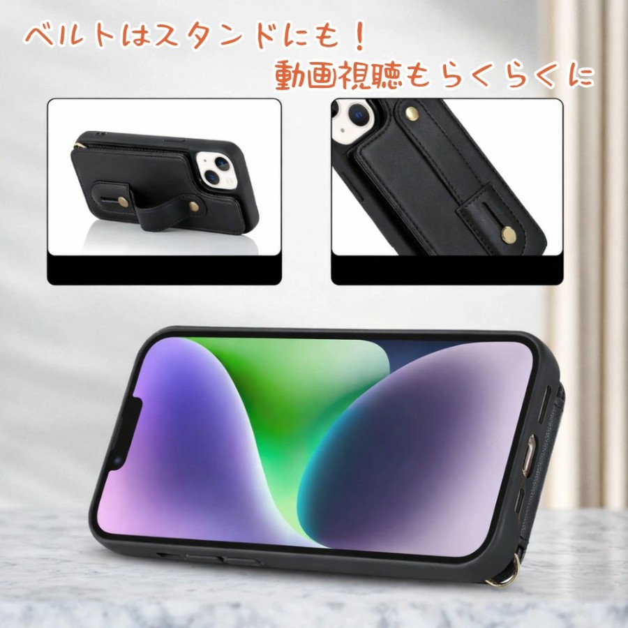 | 商品名 | カード収納 ベルトスタンド iPhoneケース iPhone15/14/13シリーズ対応 カードポケット付き 落下防止ベルト ハンドストラップ スタンド機能 耐衝撃 PUレザー スマホケース |